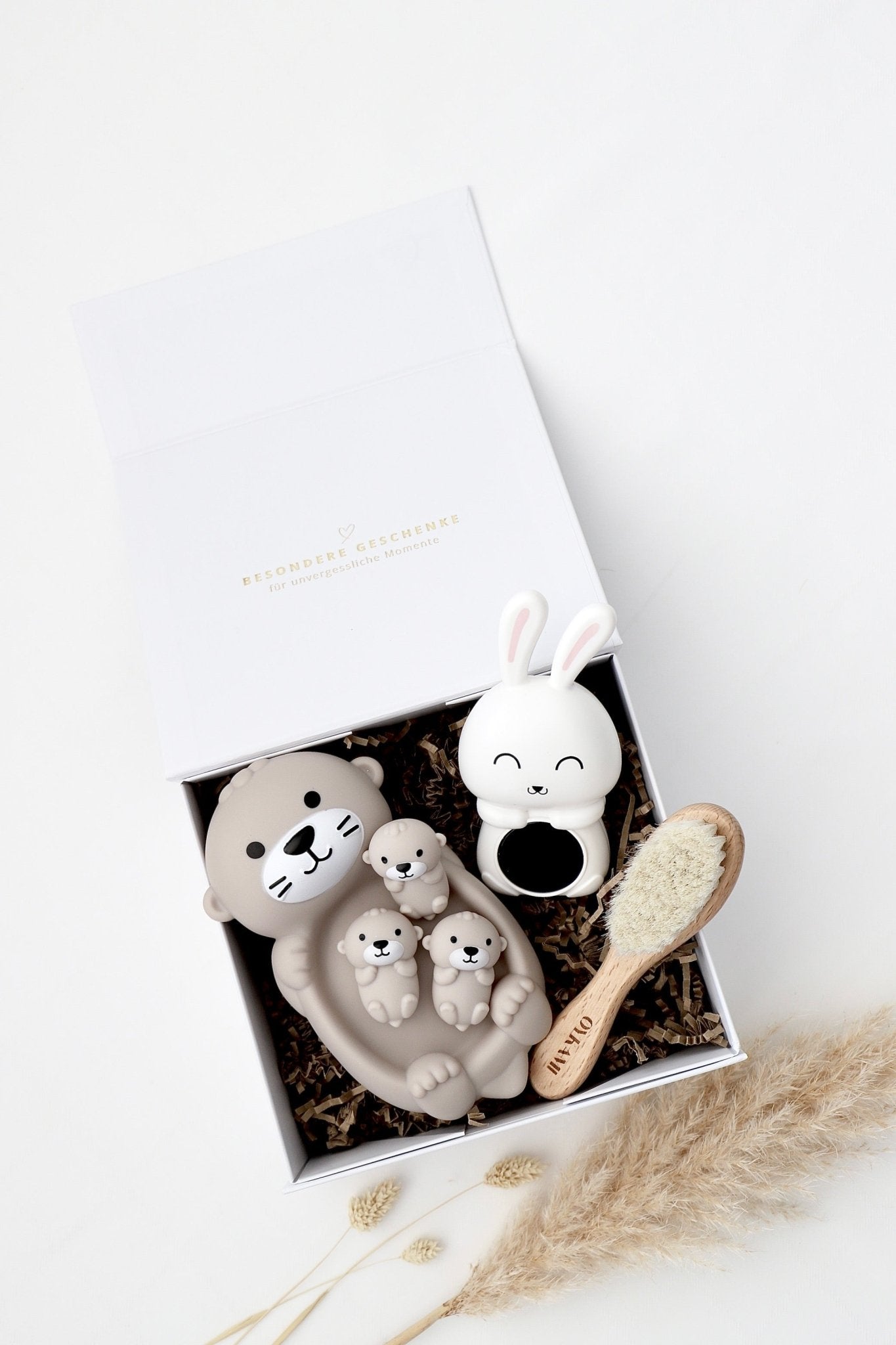 Unsere kleine Badebox ist ein liebevolles Geschenk für die ersten Badeabenteuer. Sie enthält ein süsses Otter-Spielzeug-Set, ein niedliches Hasen-Badethermometer sowie eine sanfte Babybürste aus Naturborsten.