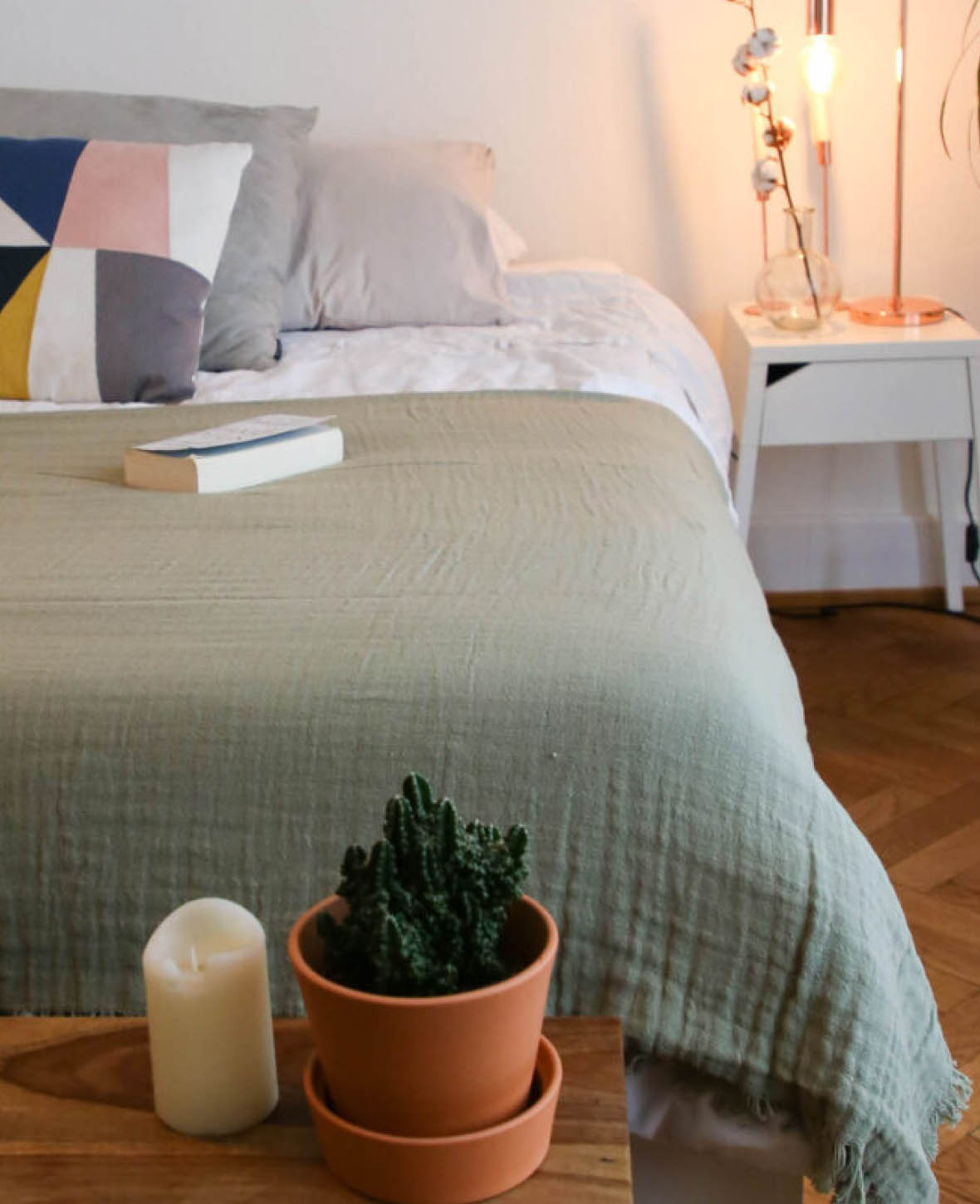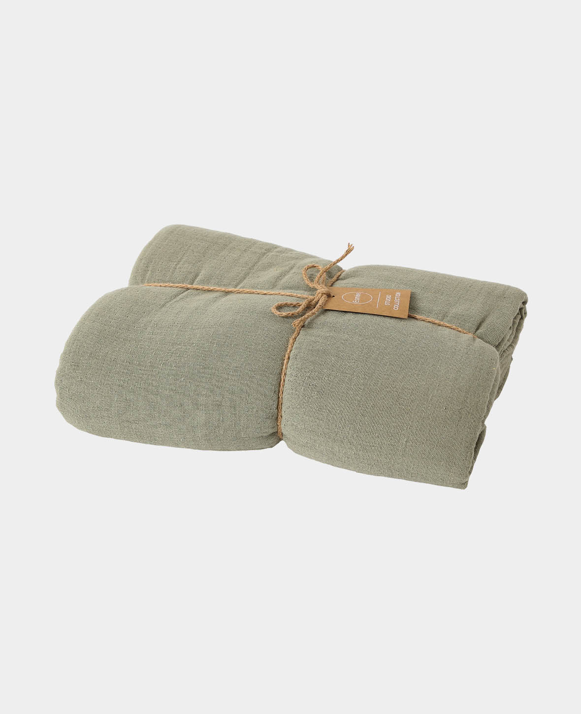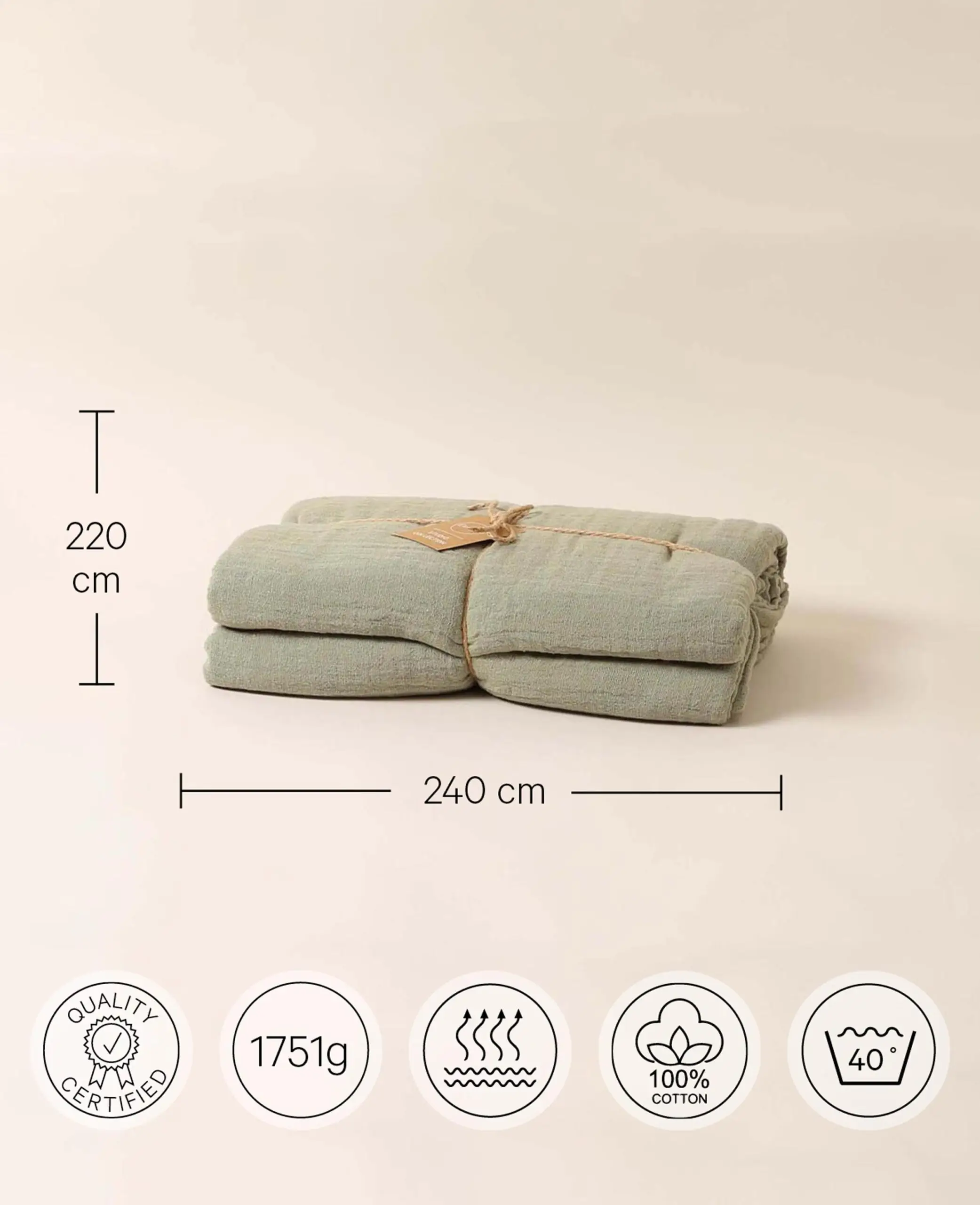 Tagesdecke aus olivenfarbenem Bio Baumwoll Musselin, 220 x 240 cm
