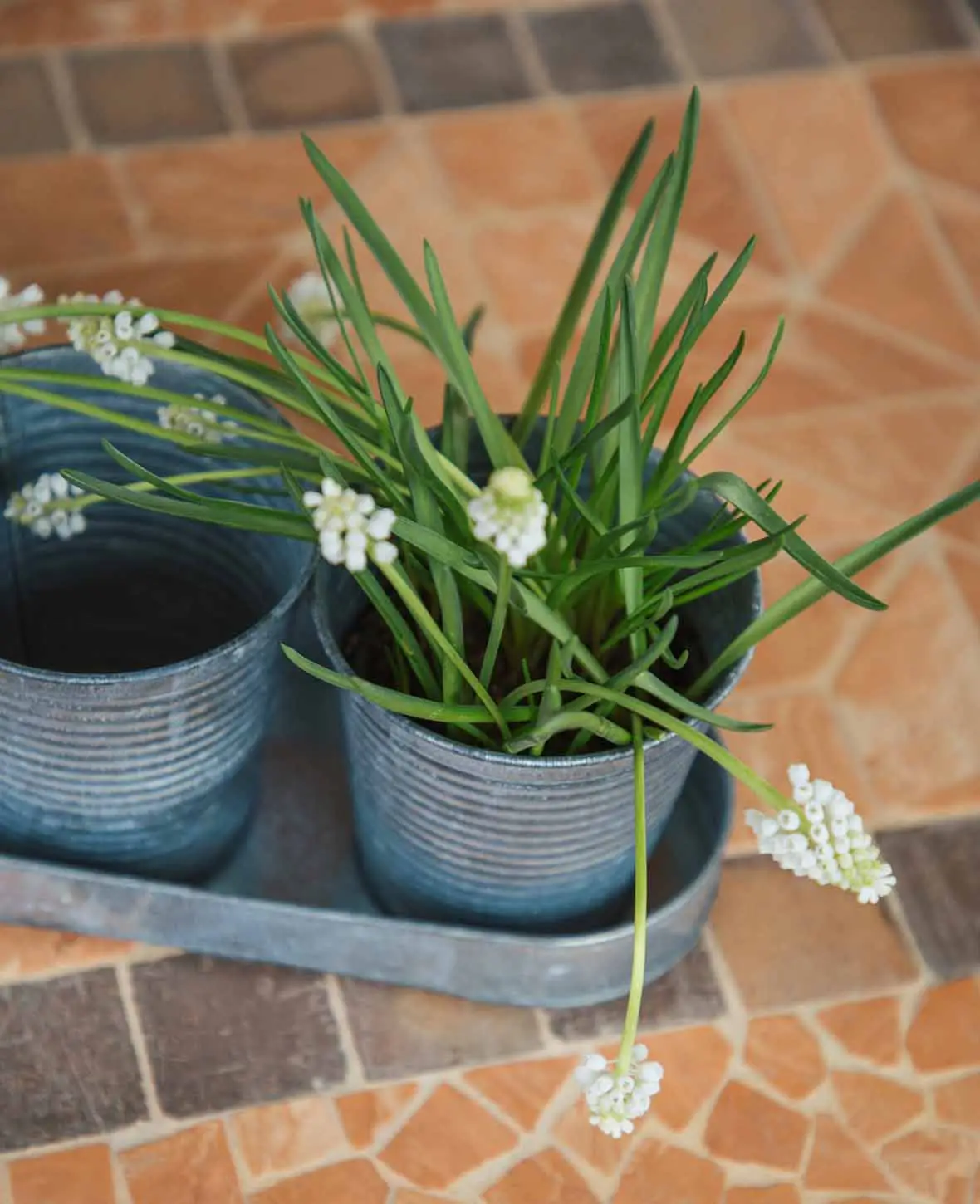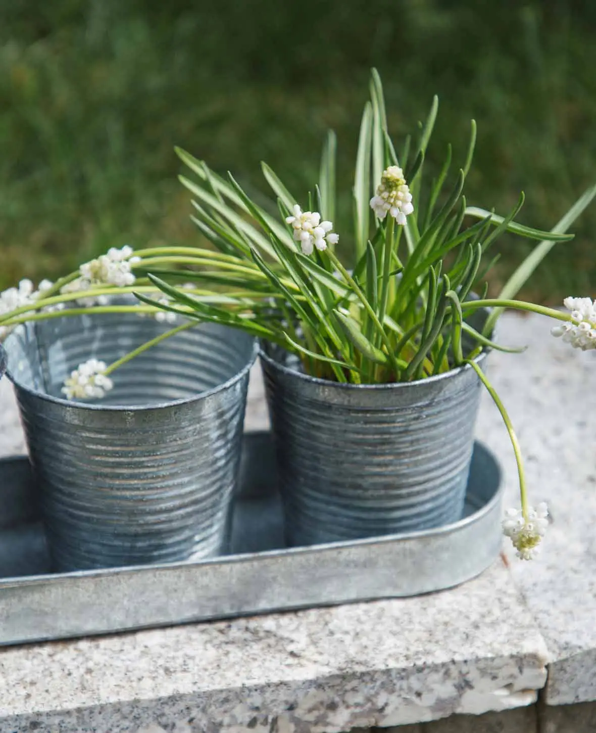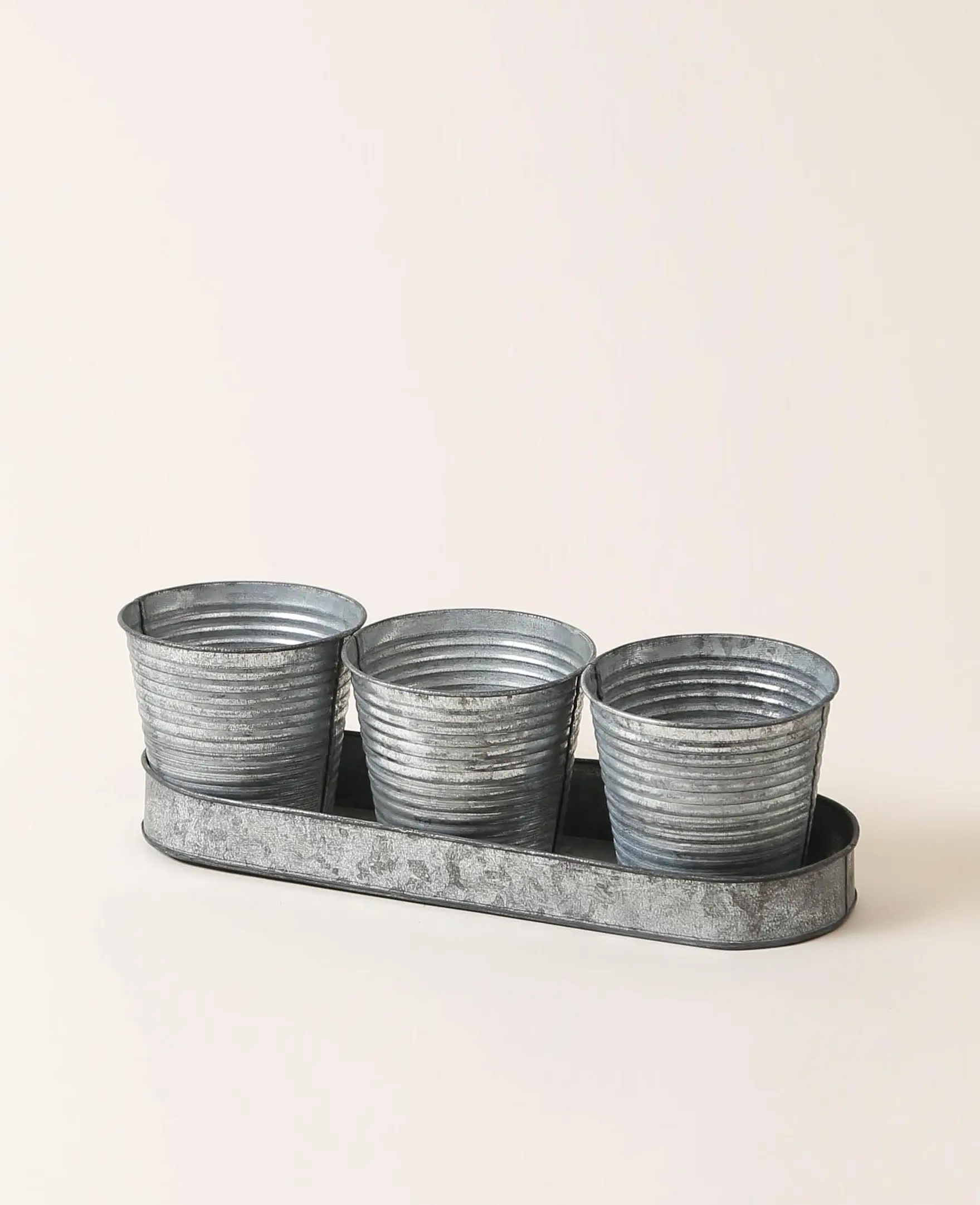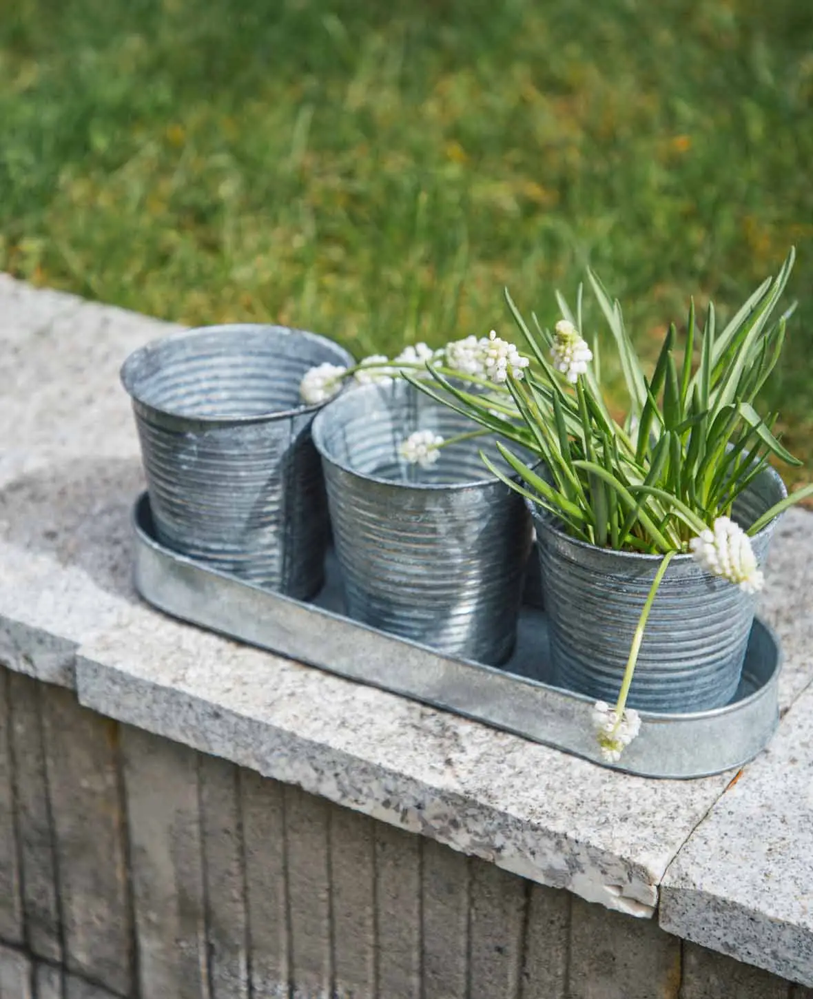 Blechtöpfe-Set, Kräutertopf 3er Set aus Blech mit Rillung und Auffangschale als Pflanzengefäss für drinnen und draussen, Urban Garden, Silbergrau, 33 x 10 cm, 1 Set
