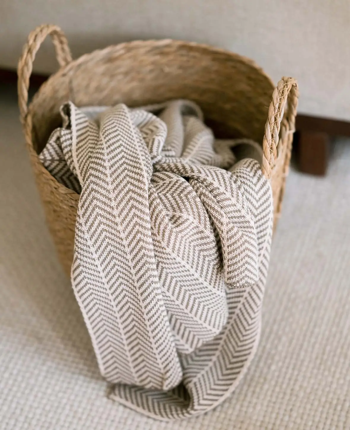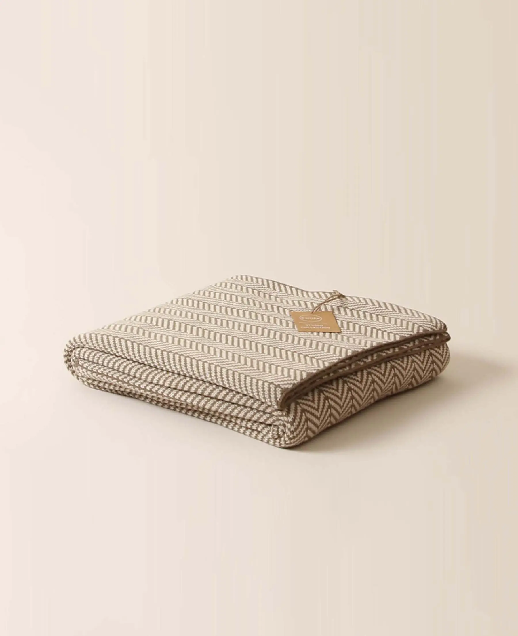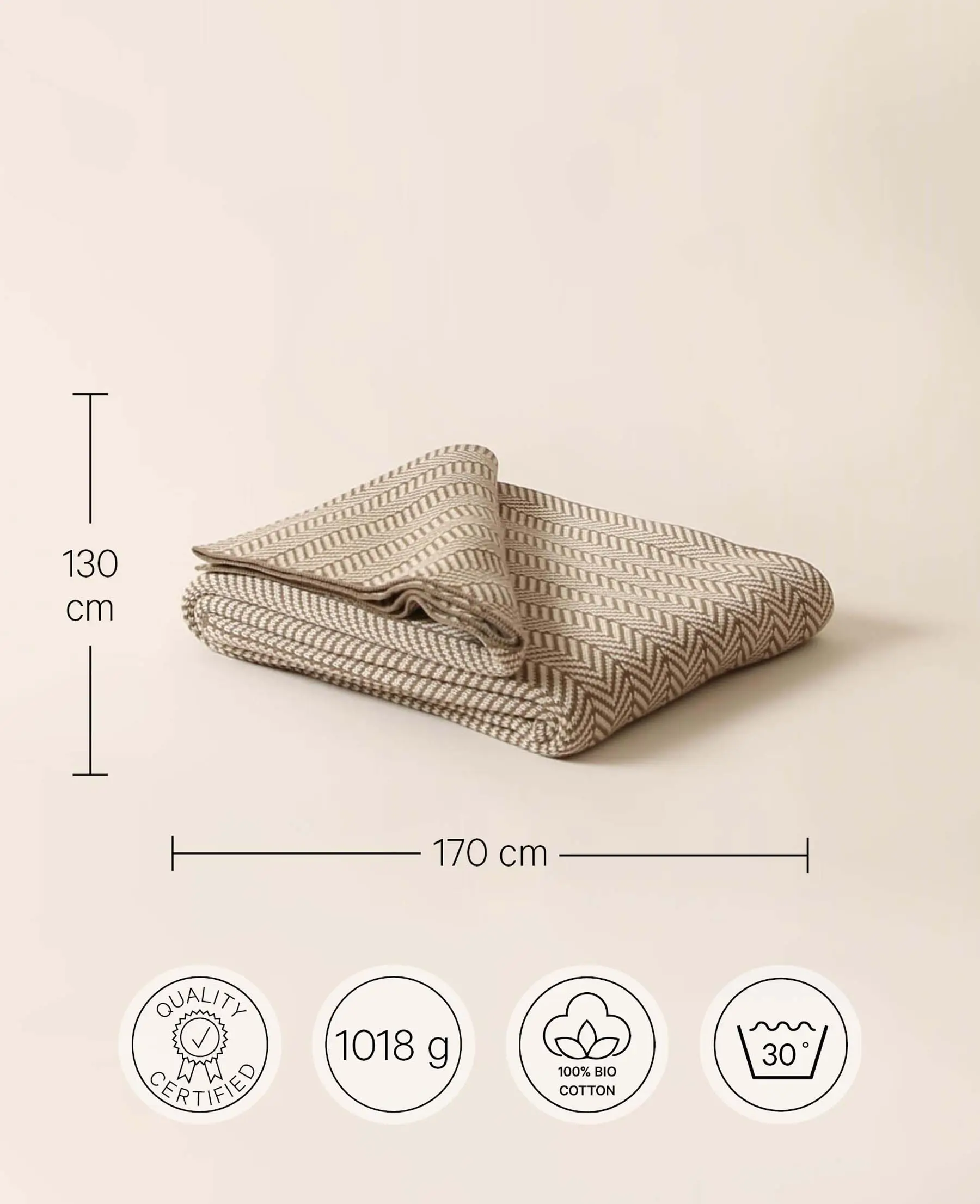 Kuschelweiche Baumwolldecke mit eingewobenem Fischgrätmuster in sanften Beige und Brauntönen. Sorgt für einen dezenten Boho Touch in Wohn- oder Schlafzimmer und überzeugt durch seine super weiche Struktur.