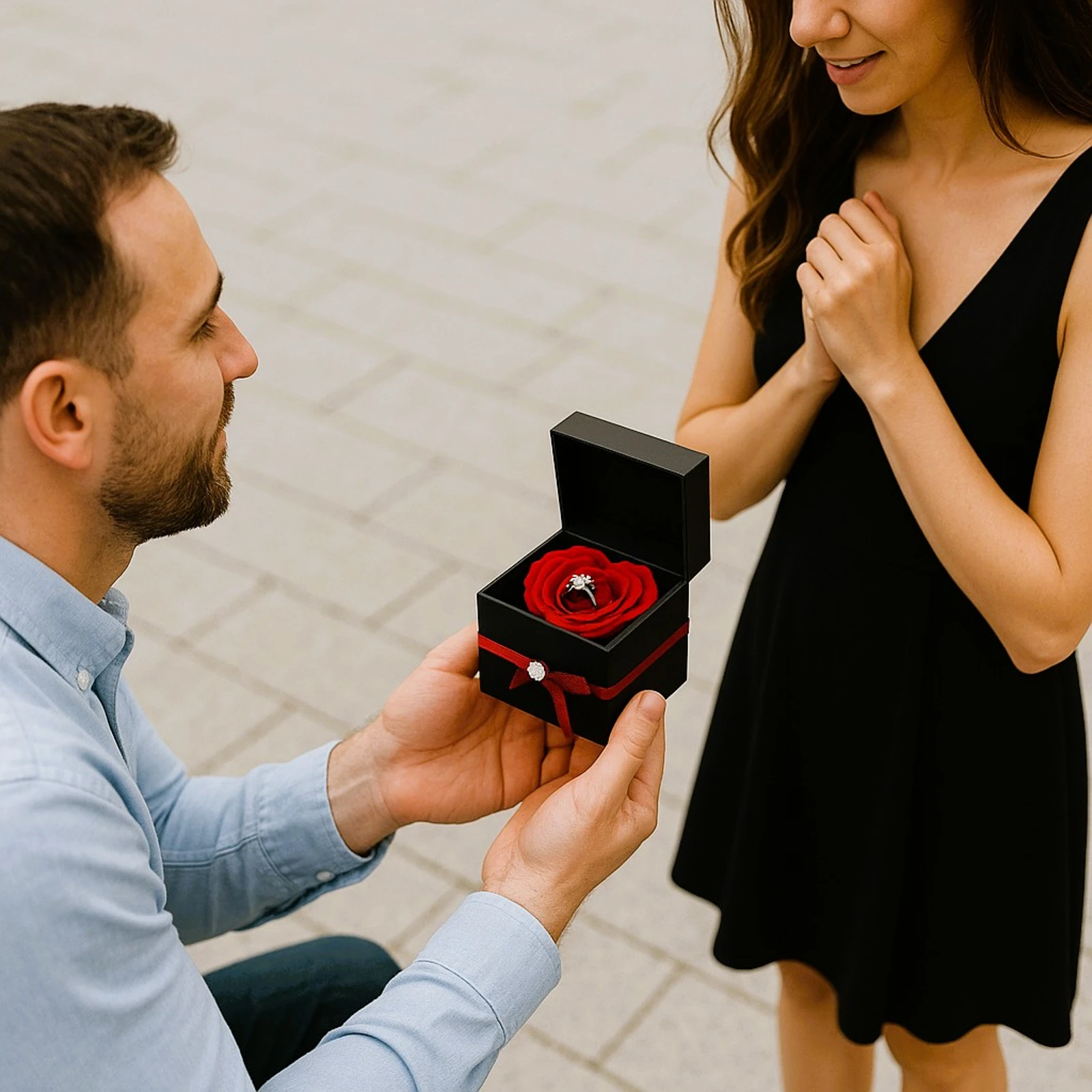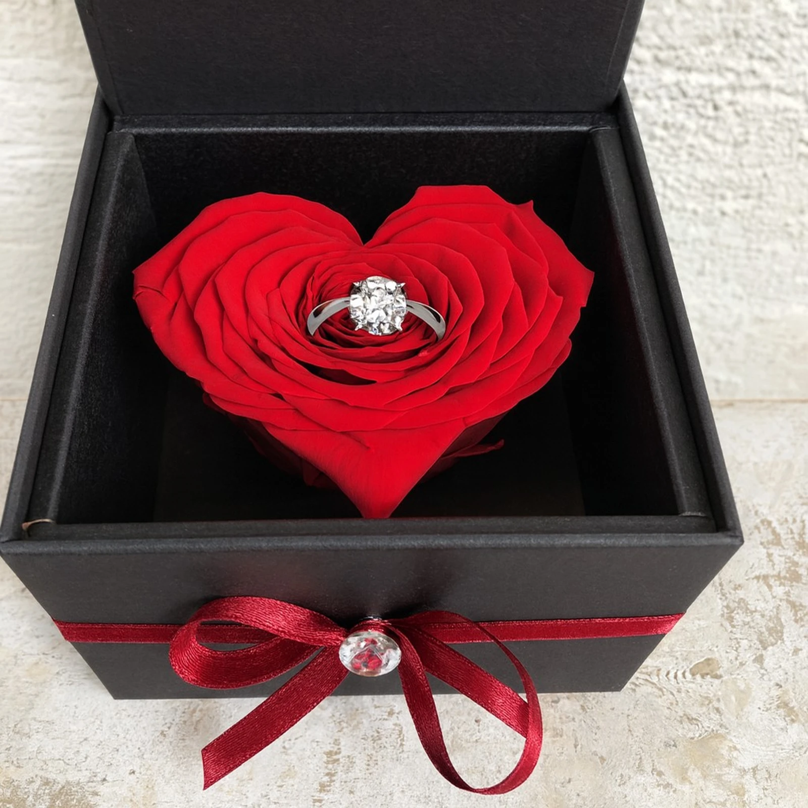 Les roses peuvent varier dans la disposition / la forme des pétales de rose. Pour l'assemblage des pétales de roses, du ruban, etc., on utilise aussi de la colle / du fil de fer et d'autres éléments similaires qui peuvent aussi être visibles. La boîte est conçue en carton/papier et peut présenter des ombres/restes de colle et des bords en raison du processus de collage. Important : la bague en tant que bijou est insérée comme idée et ne fait pas partie du produit !