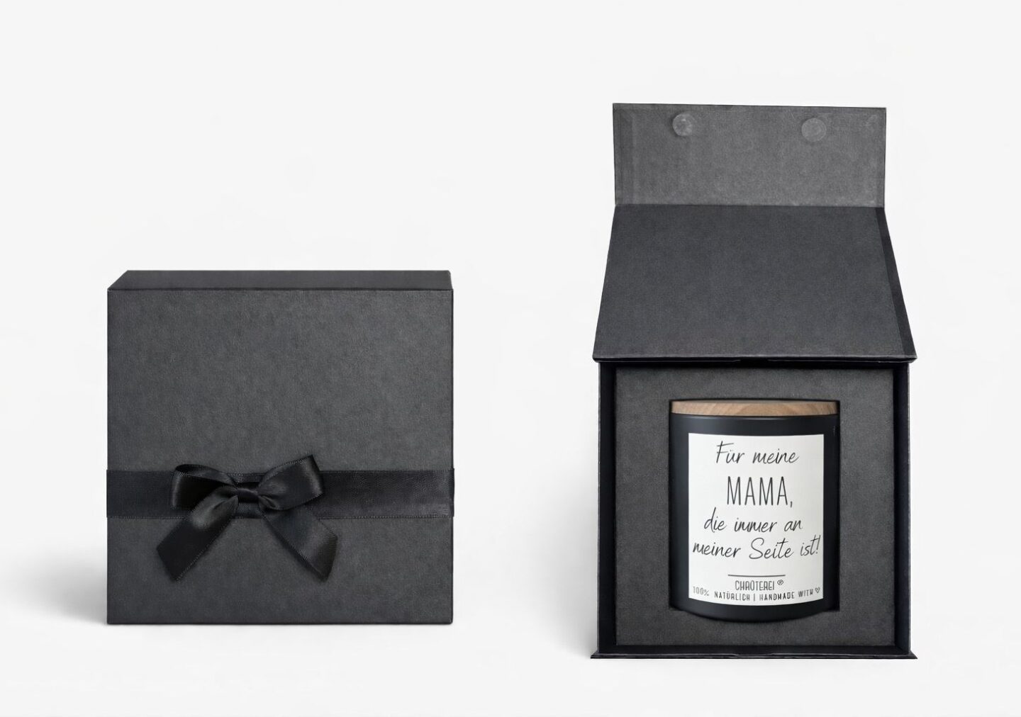 Bougie parfumée dans 3 parfums différents avec un emballage cadeau noir mat élégant avec un nœud en satin et un insert pour le transport.