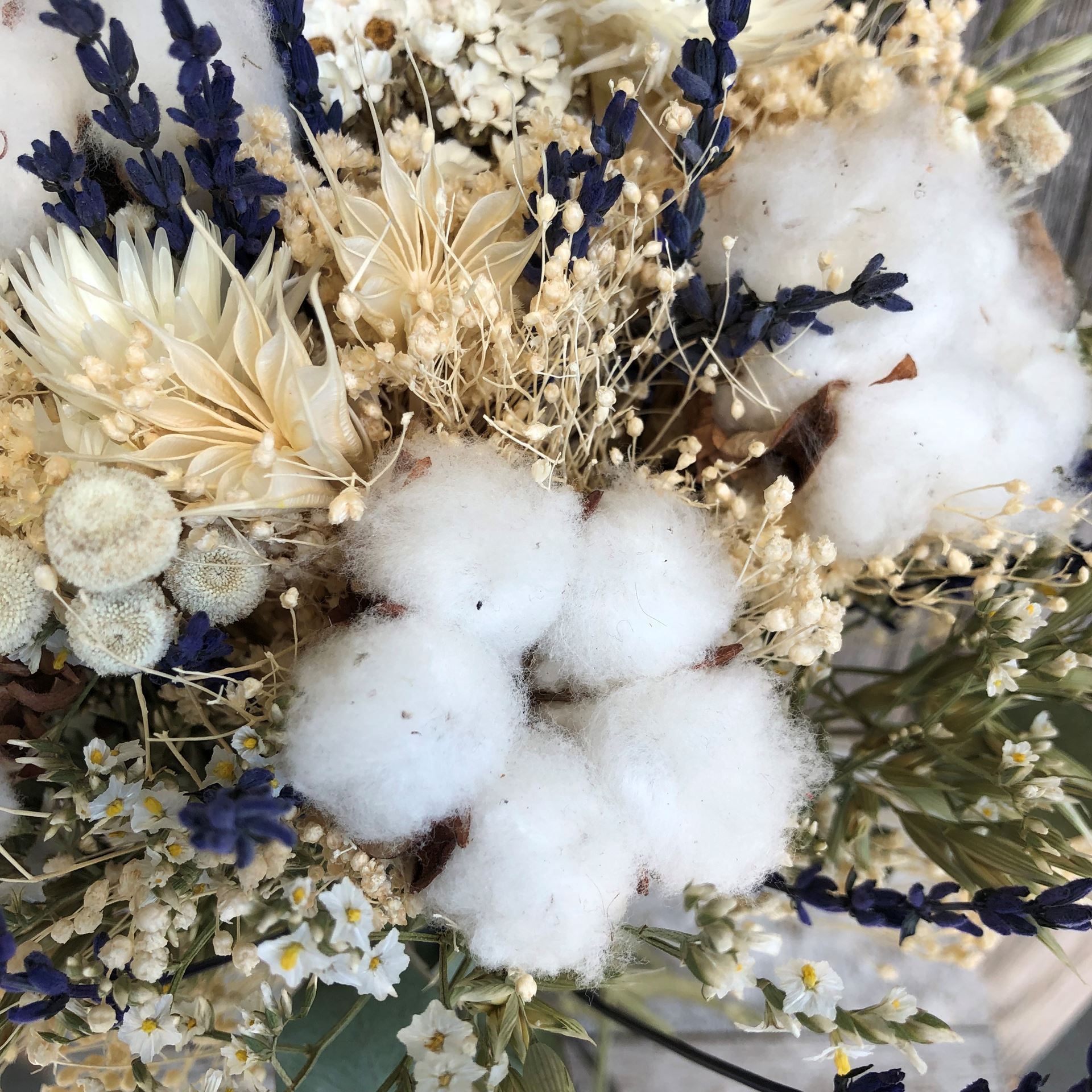 Fleurs séchées - la nouvelle tendance en matière d'intérieur ; bouquet de fleurs séchées "Creme" avec coton - eucalyptus & lavande Ø env.20 cm H env.35 cm