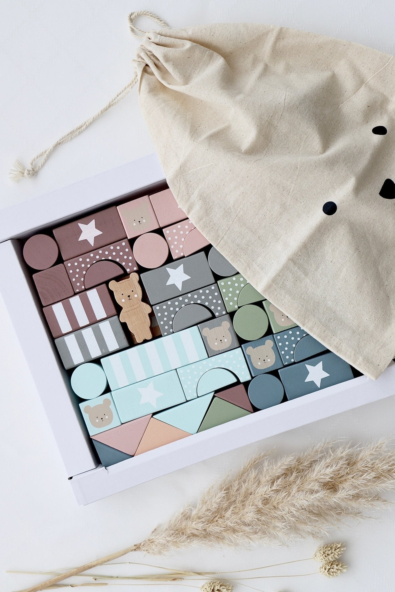 - Jeu de cubes en bois de Jabadabado : le jeu se compose de 49 blocs de construction de 7 formes différentes, rangés dans un joli sac en tissu- carte postale surprise