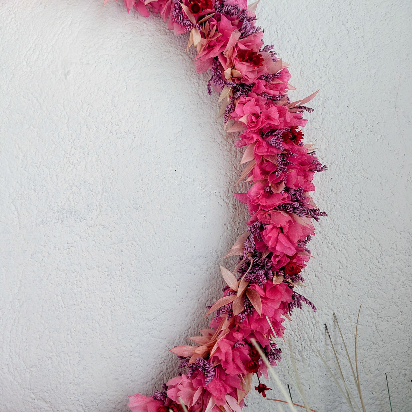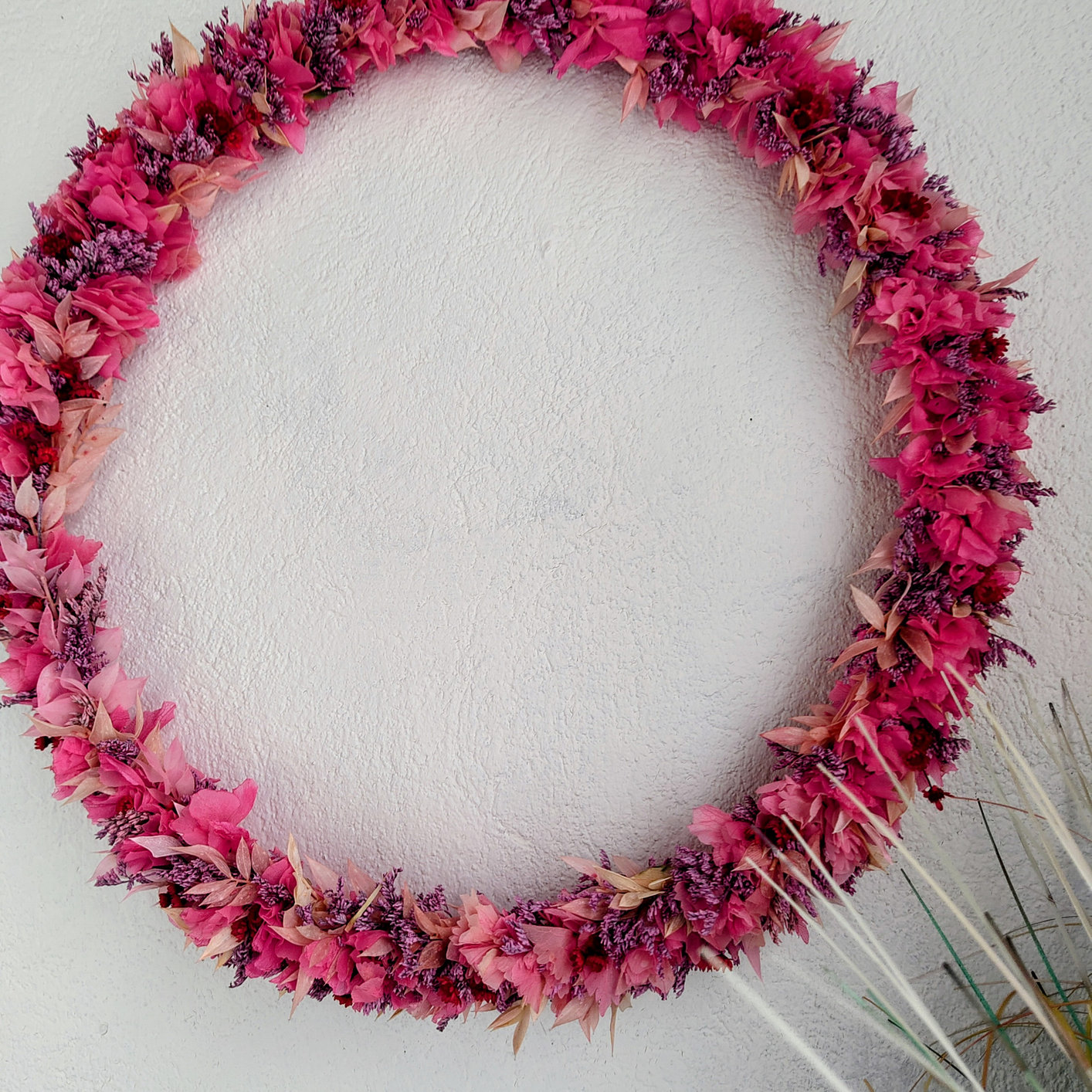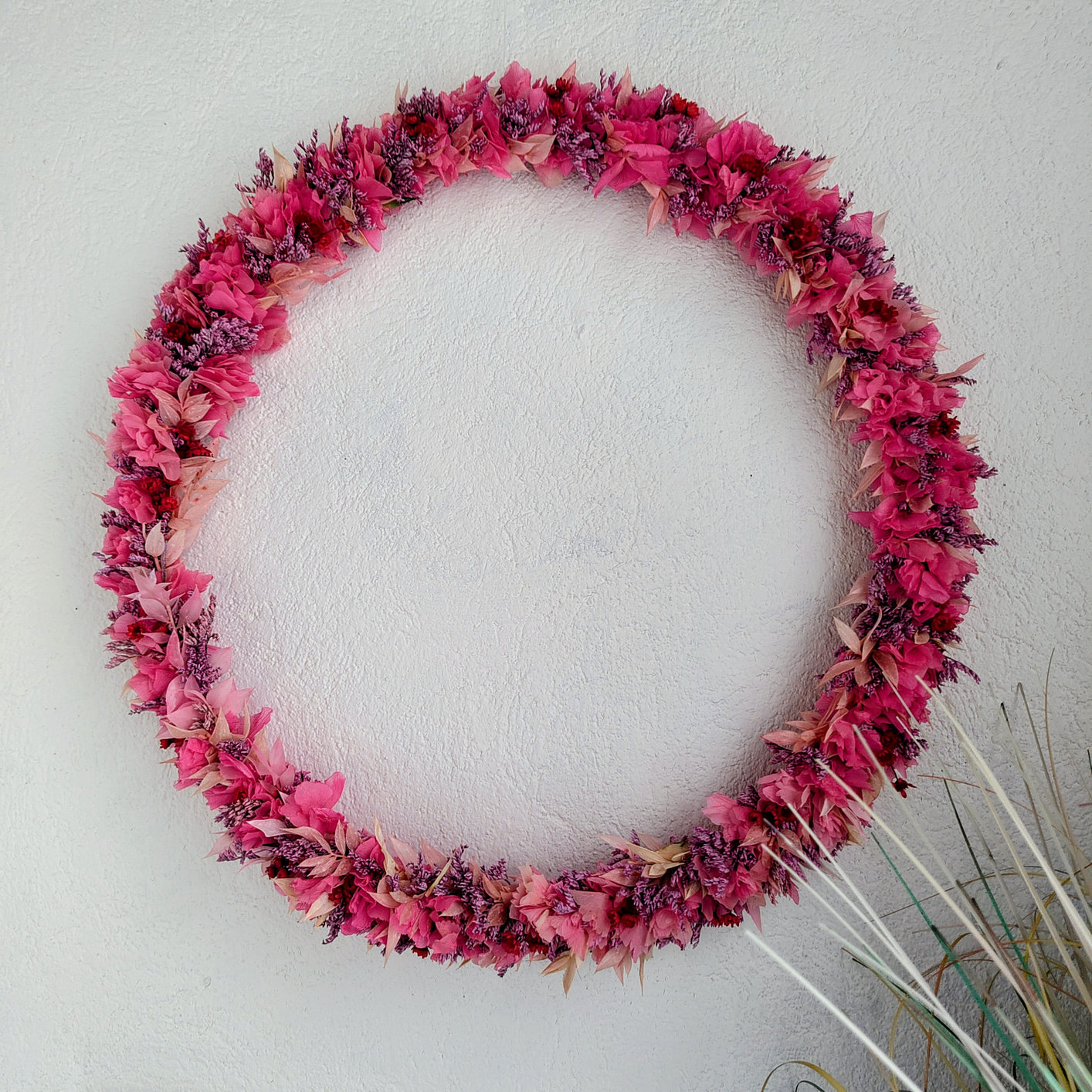 Cette magnifique couronne faite à la main, composée de fleurs séchées et d'hortensias conservés dans des tons roses, embellit n'importe quelle pièce ou porte d'entrée et mesure environ 38 cm de diamètre.