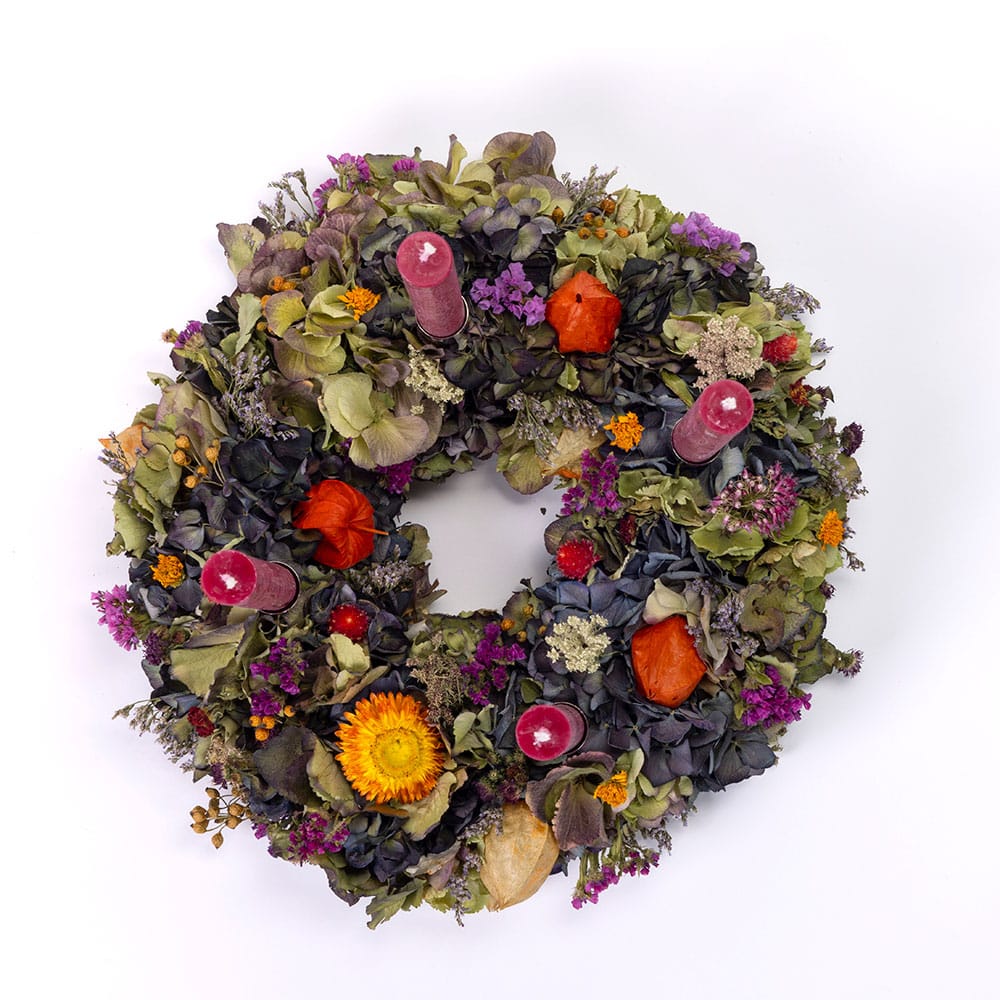 Couronne de l'Avent Fleurs séchées multicolores, bougies Bordeaux - environ 35 cm de diamètre