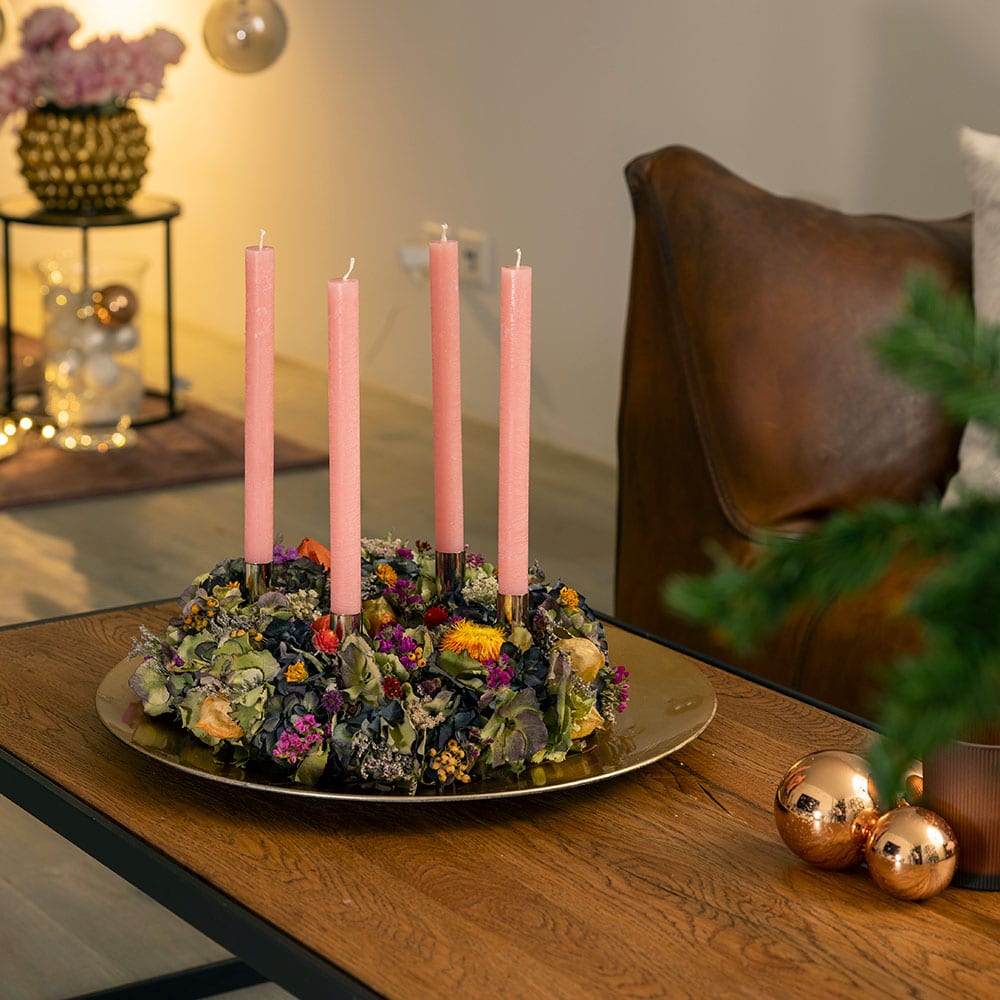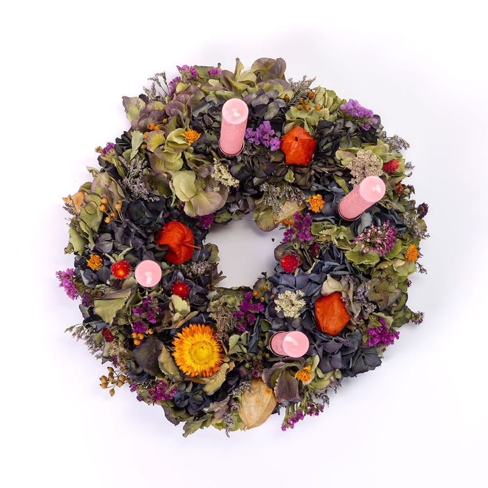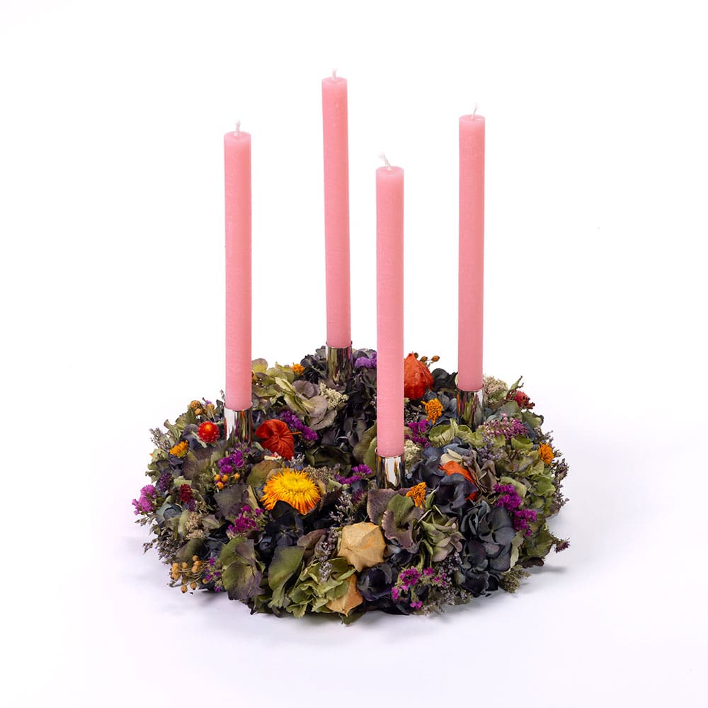 Couronne de l'Avent Fleurs séchées multicolores, bougies rose pâle - environ 35 cm de diamètre