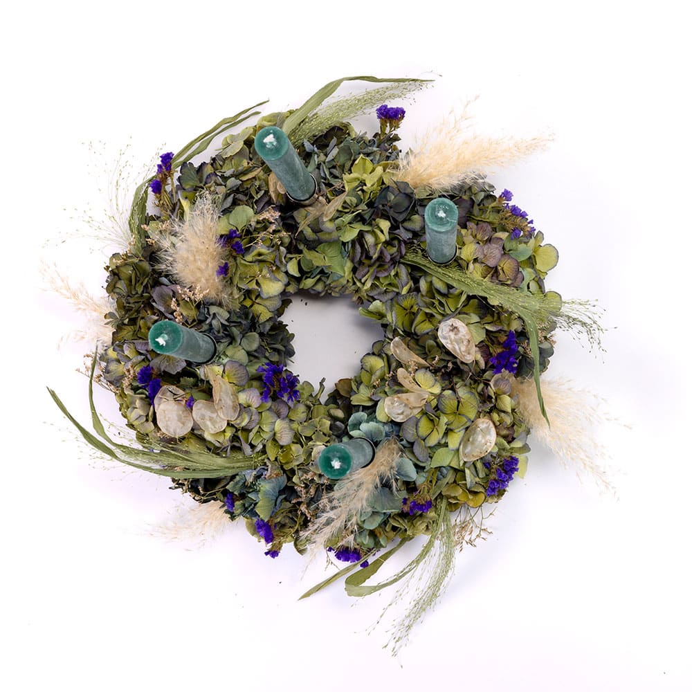Couronne de l'Avent fleurs séchées sauvages, bougies vert sapin - environ 35 cm de diamètre