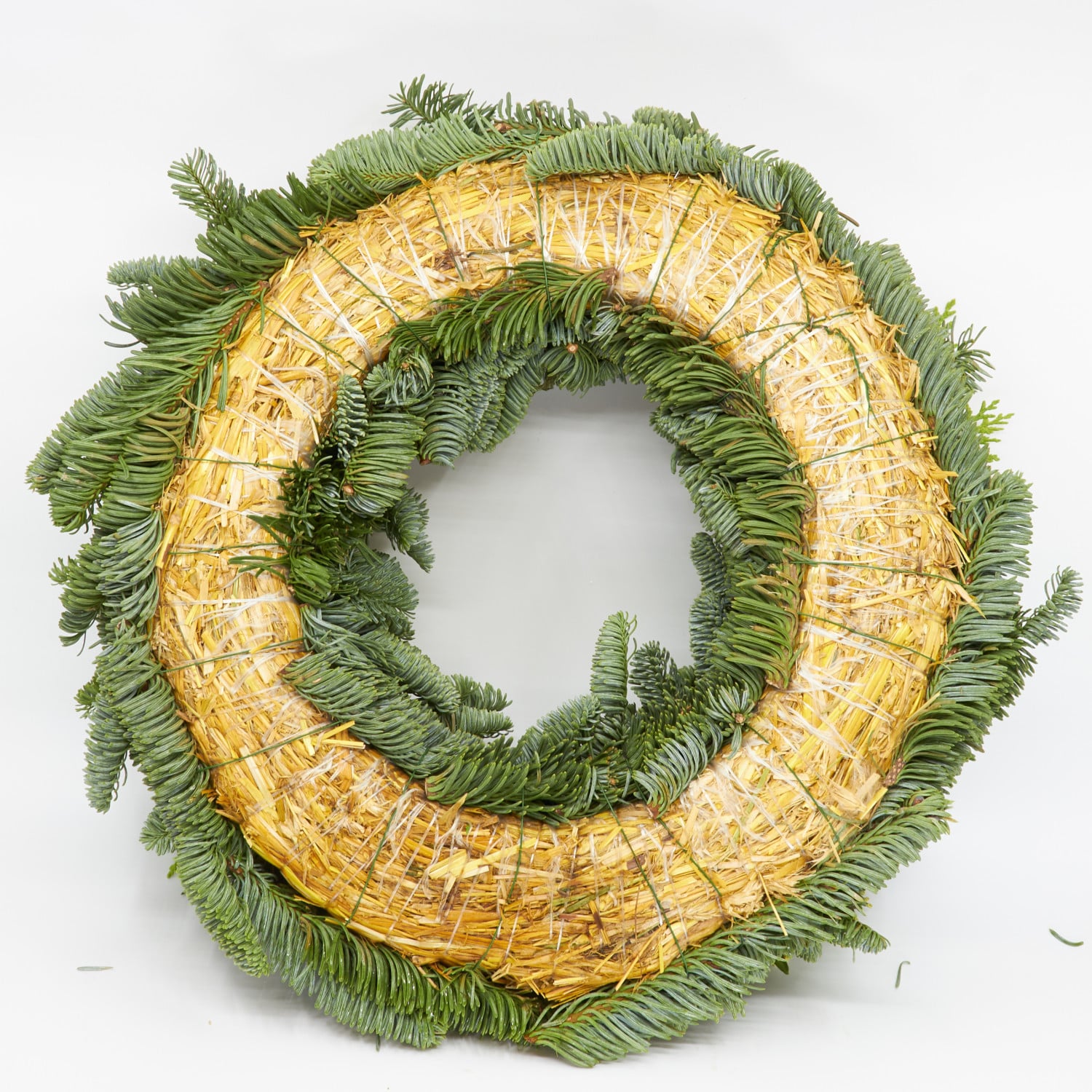 Couronnes liées à la main pour les couronnes de l'Avent, les décorations de porte, les assiettes à bougies ou autres pièces florales. Lié sur un support de paille avec des feuilles d'hiver mélangées.