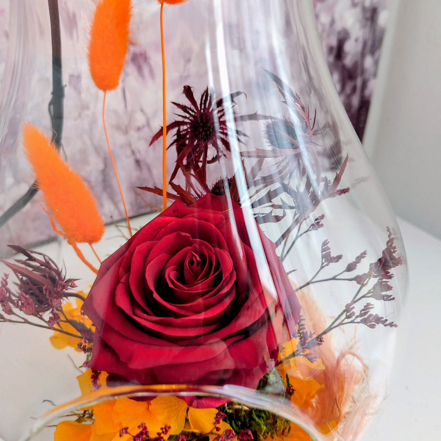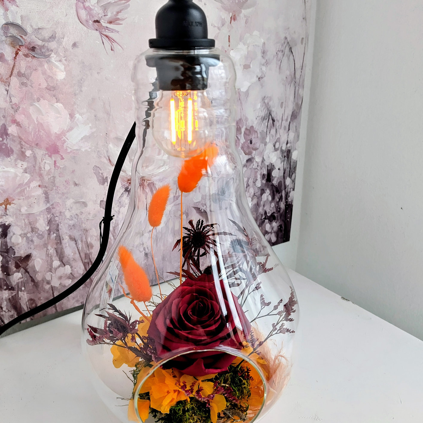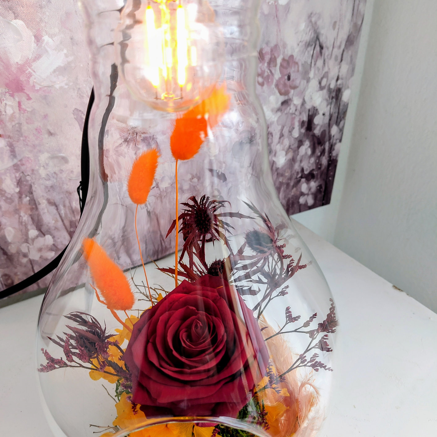 Verleihe deinem Zuhause mit dieser wunderschönen Lampe aus einer konservierten roten Rose und getrockneten, konservierten Pflanzen eine besondere Atmosphäre. Sie hält mehrere Jahre, ohne dass sie gepflegt werden muss.