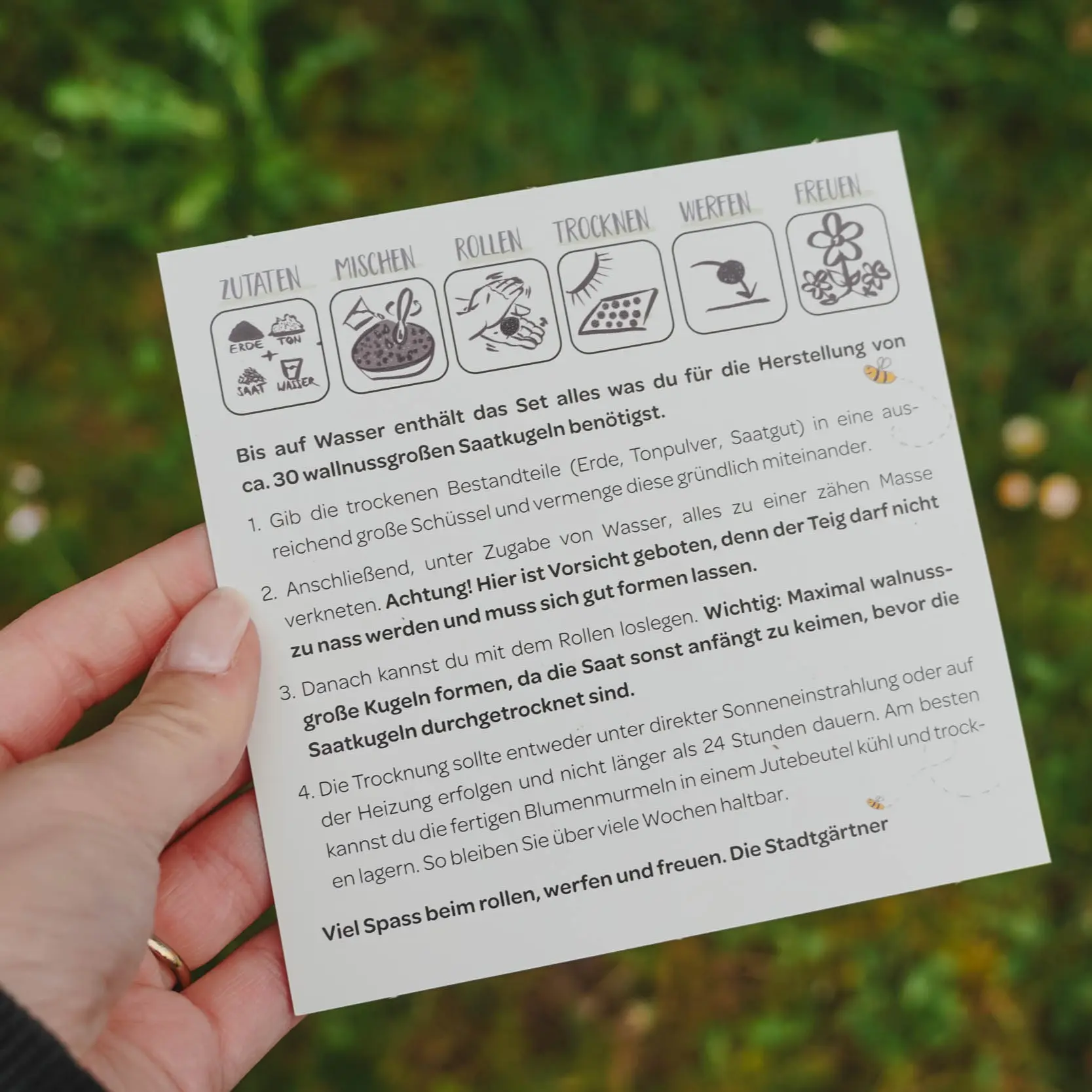 Contenu : Mélange de graines, terre de jardin nutritive, poudre d'argile ou de glaise, instructions (le contenu suffit pour environ 30 billes de fleurs)
