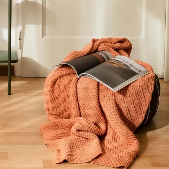 Ce plaid en coton doux et moelleux apporte une touche de couleur fraîche à ton intérieur. L'orange doux et branché se combine merveilleusement bien avec les tons de beige ou de vert et crée une ambiance pleine de style.