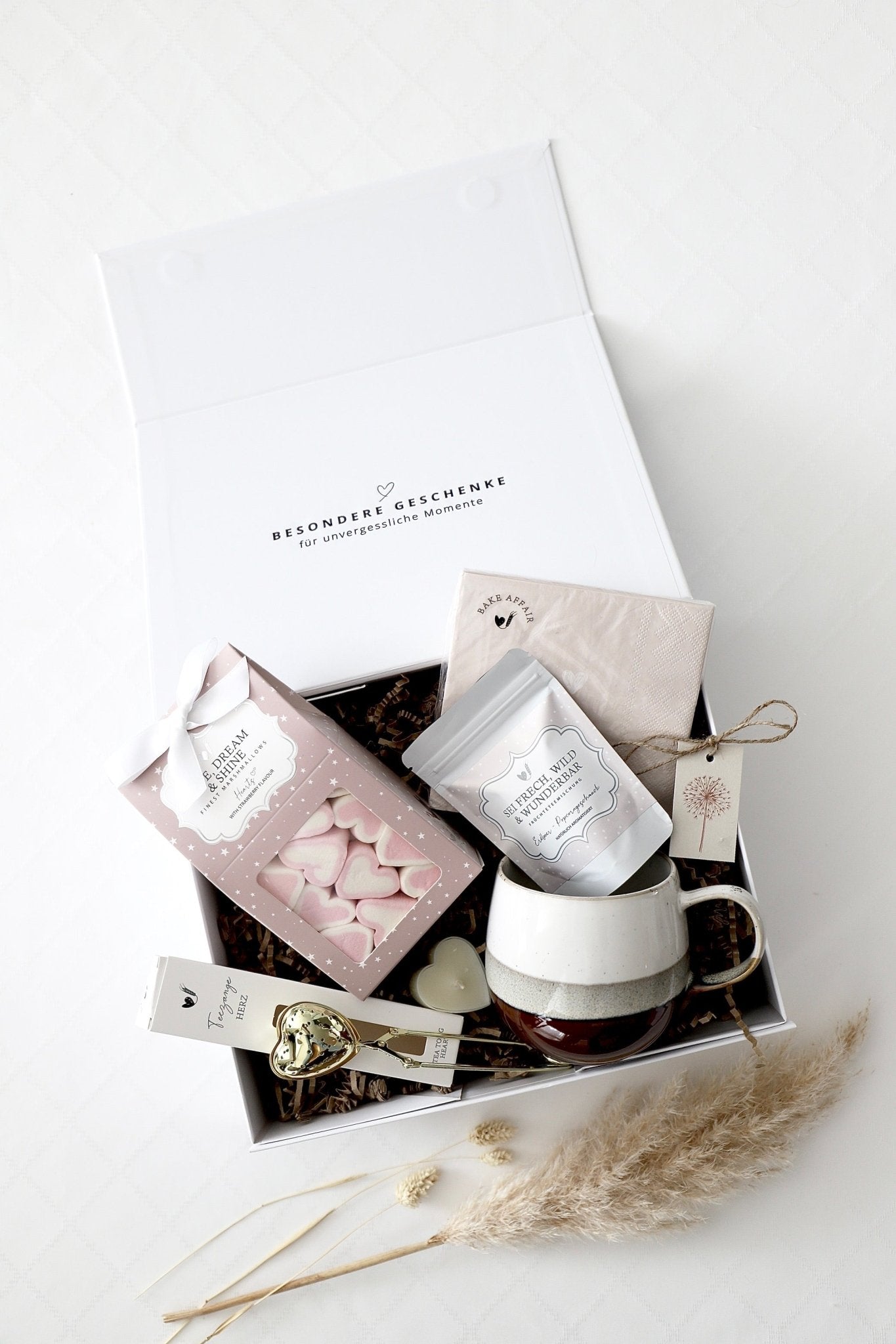Die „Cozy Tea Time“-Box lädt zu einer besonderen Pause voller Wärme und Genuss ein. Mit einer eleganten Tasse, süssen Leckereien und feinem Tee wird jeder Moment zu einem kleinen Highlight. Liebevolle Details wie das Herz-Teesieb und die zarten Servietten machen die Teepause noch schöner. Ob für einen gemütlichen Nachmittag oder als liebevolles Geschenk – diese Box ist ein echter Herzensmoment.