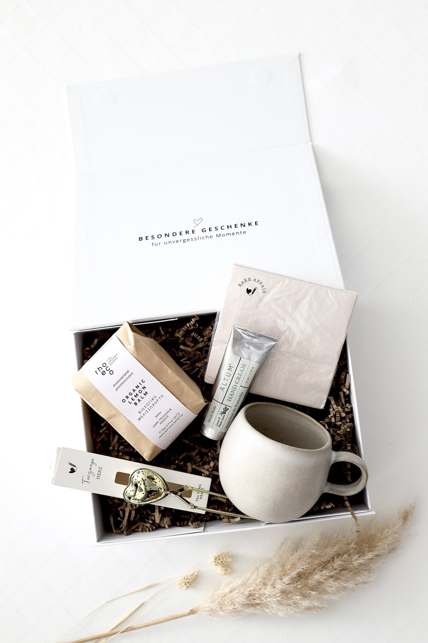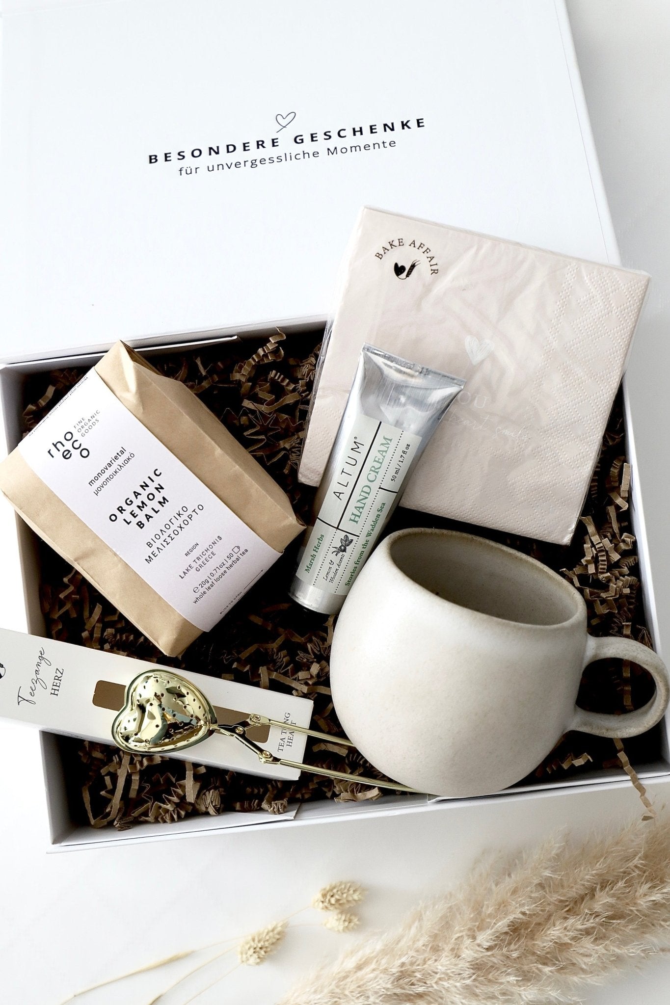 Die „Fresh Tea Glow“-Box verbindet belebenden Teegenuss mit kleinen Wohlfühlmomenten. Frischer Bio-Pfefferminztee sorgt für einen klaren Kopf und erfrischende Auszeiten, während die pflegende Handcreme für samtweiche Hände sorgt. Die stilvolle Tasse, das goldene Herz-Teesieb und feine Servietten machen die Teepause komplett. Ein Geschenk voller Leichtigkeit und Frische – ideal für alle, die Energie tanken und sich kleine Genussmomente gönnen möchten.