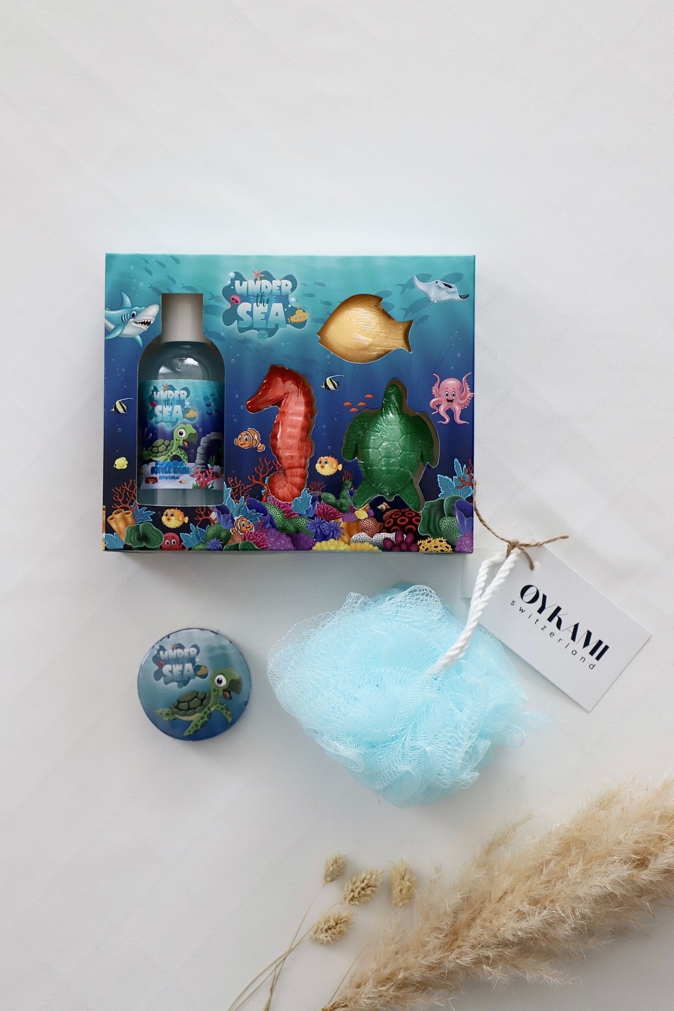– Geschenkset under the sea , Pflegeset in Geschenkbox, inkl. 150ml Schaumbad, 3 x Seife (32g Schildkröte, 24g Seepferdchen, 18g Fisch), Duft: Blueberry blast, Farbe: blau/orange, hergestellt in Deutschland