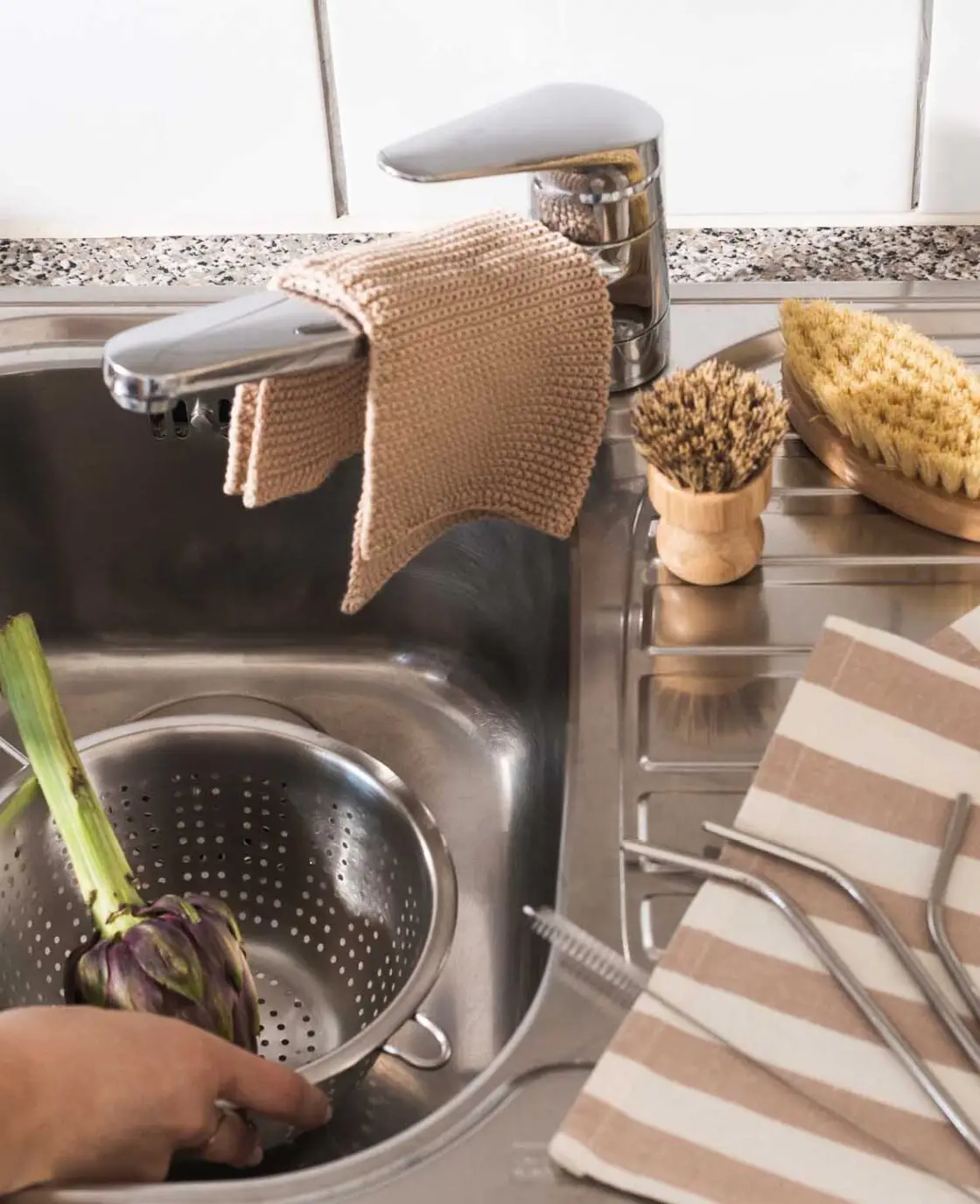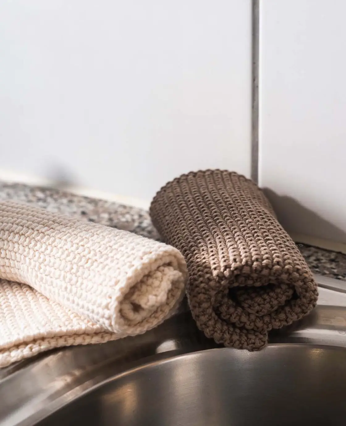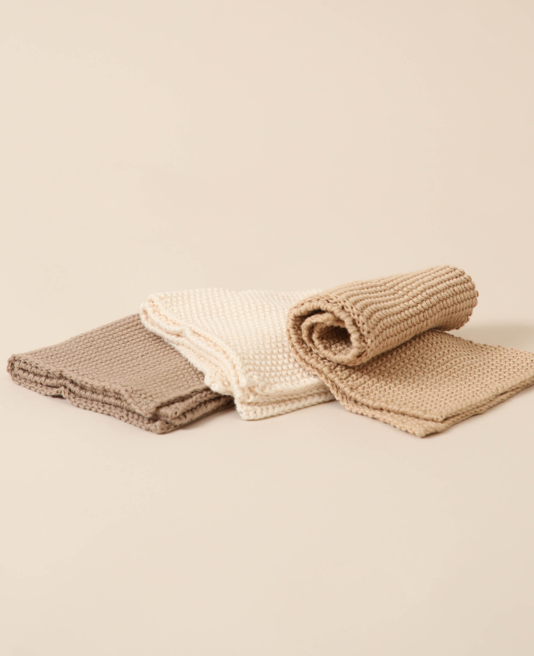 Die drei hochwertigen Spültücher in beige, braun und off White aus gestrickter Baumwolle eignen sich wunderbar zum Spülen oder Putzen der Küche und des Bads. Alternativ lassen sie sich auch ideal als Gesichts- oder Handtücher verwenden, da ihre weiche Struktur, frei von Mikroplastik, für eine sanfte Reinigung sorgt.
