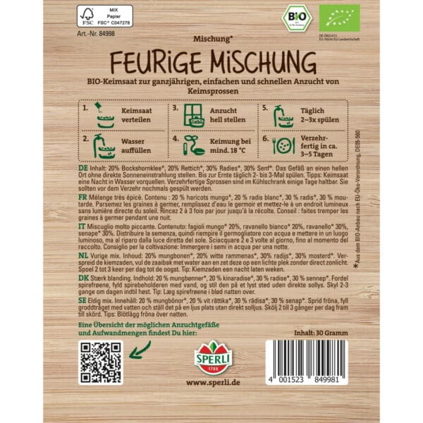 Contenu : 20% fenugrec* 20% radis*, 30% radis* 30% moutarde*. Placer le récipient dans un endroit clair, sans lumière directe du soleil. Rincer 2 à 3 fois par jour jusqu'à la récolte. Conseils : Faire tremper les graines germées une nuit dans l'eau. Les germes prêts à être consommés se conservent quelques jours au réfrigérateur. Elles doivent être rincées une nouvelle fois avant d'être consommées.