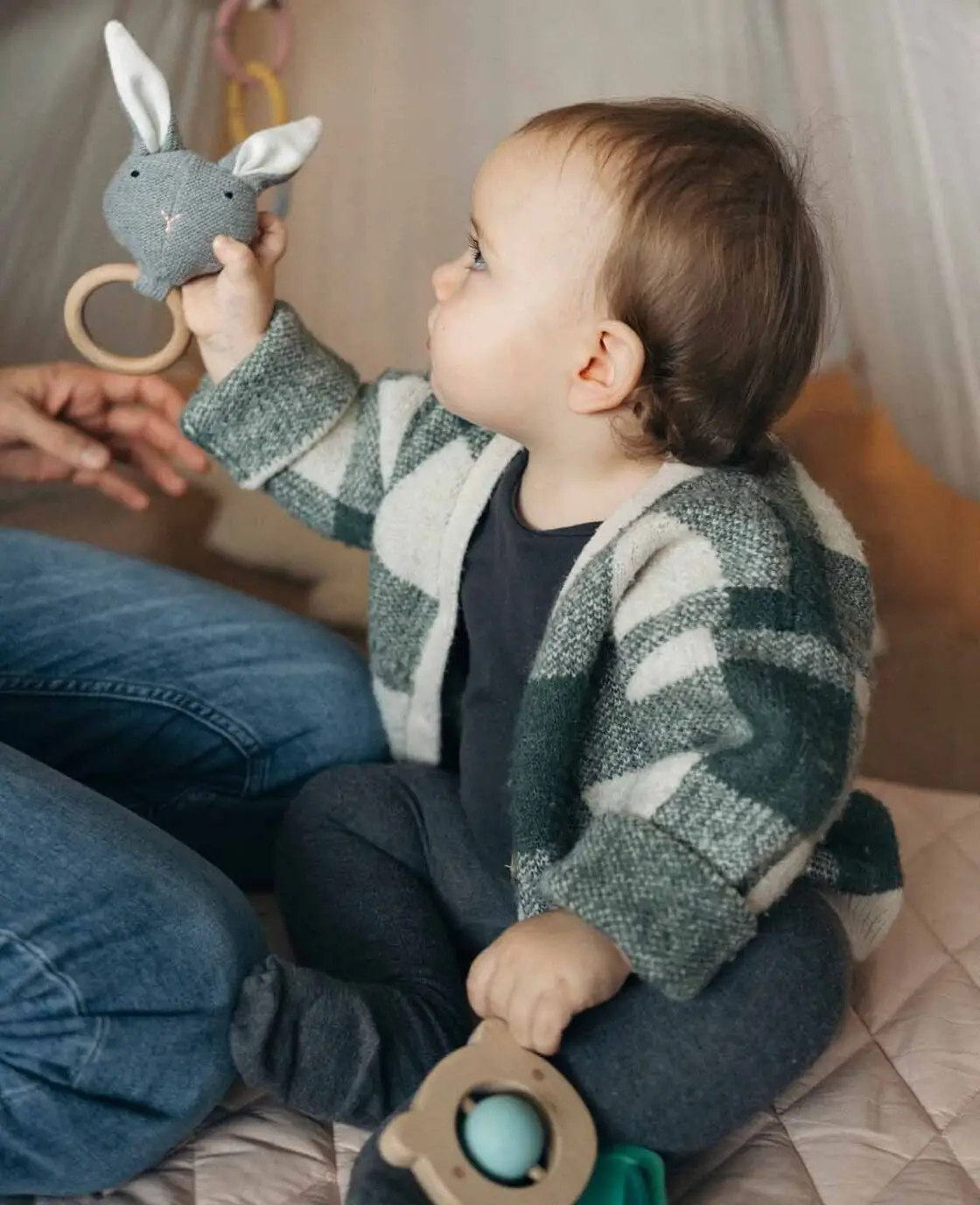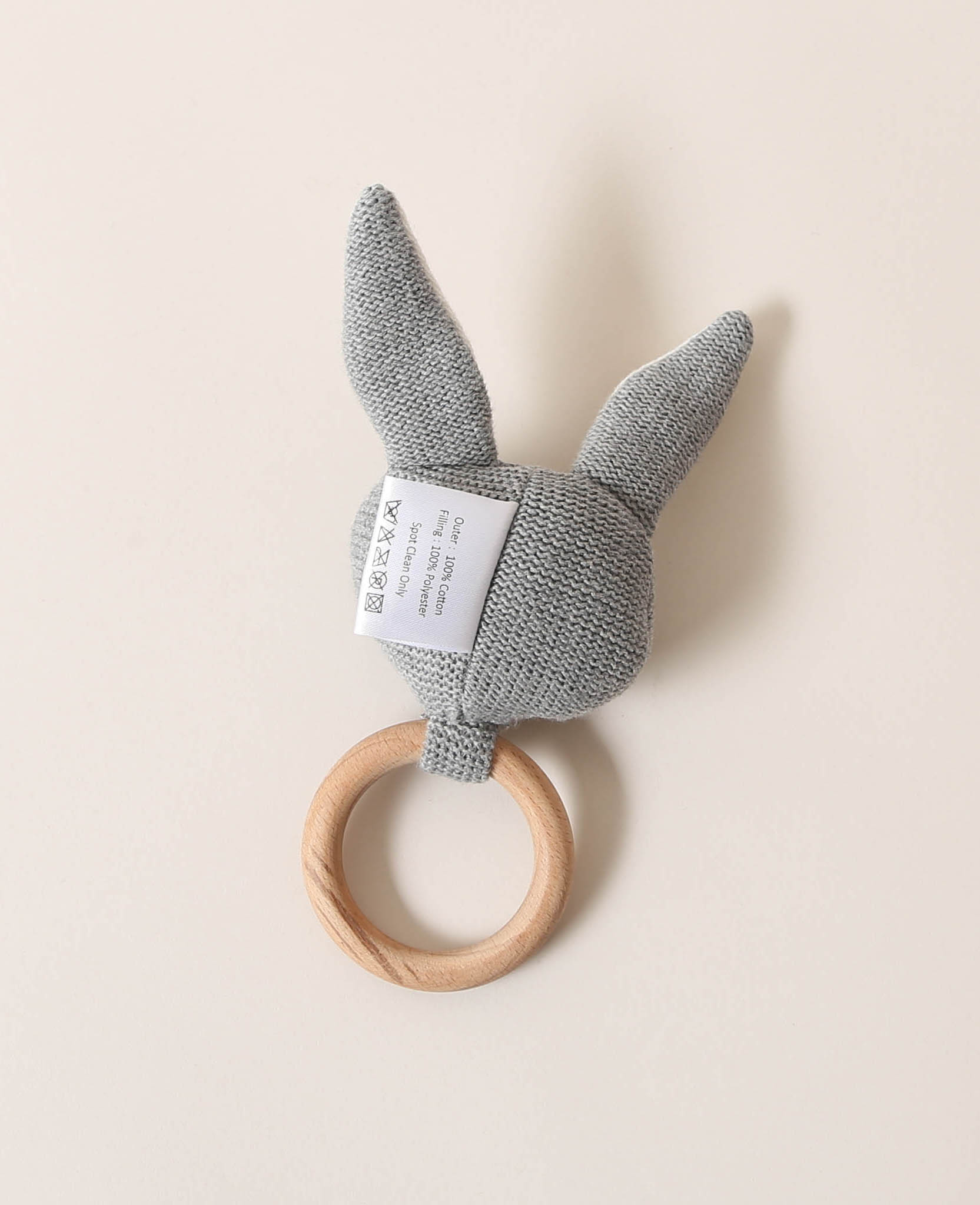 Baby Holz Beissring mit Hase aus gestrickter Baumwolle