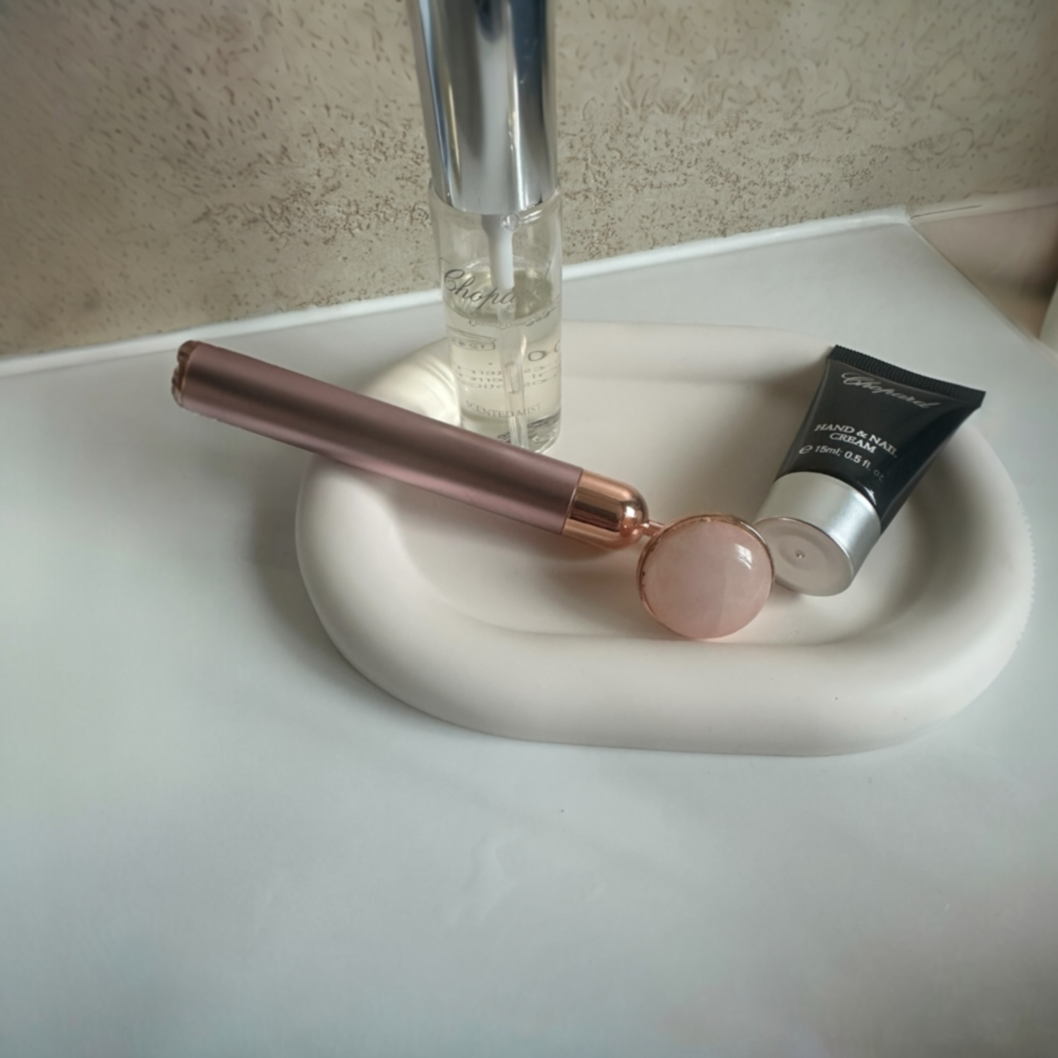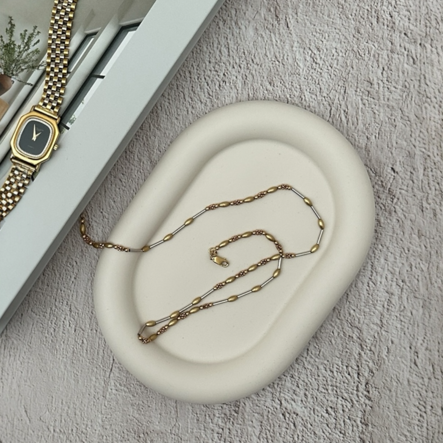 Un plateau minimaliste fait à la main en éco-composite minéral. Avec son doux ovale Sa forme et sa surface lisse et mate en crème sont idéales pour les petits objets du quotidien.