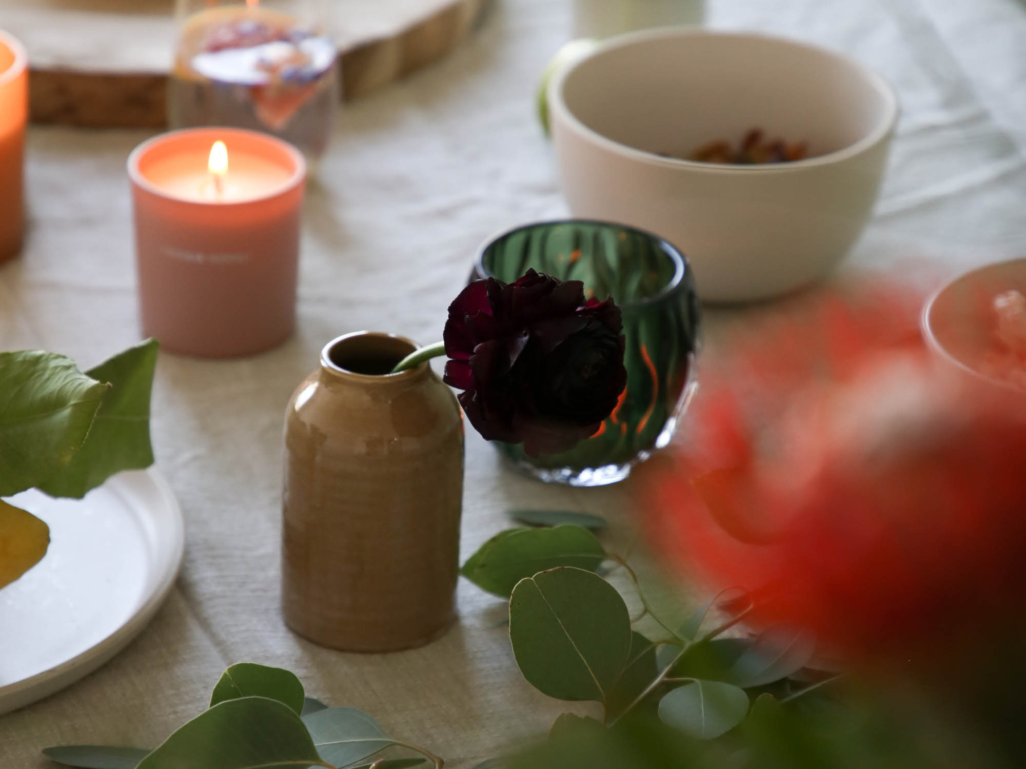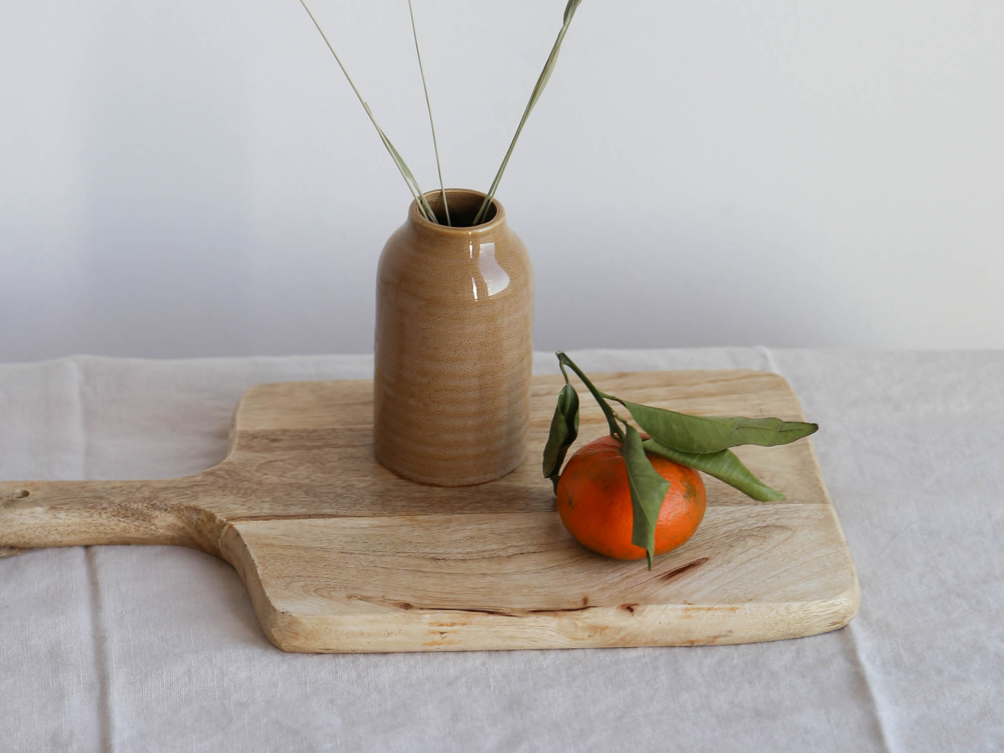Diese skandinavische Mini Vase aus Steingut mit ockerfarbener Glasur setzt jede Feldblume in Szene. Dank der Handglasur ist jede dieser Vasen ein Unikat.