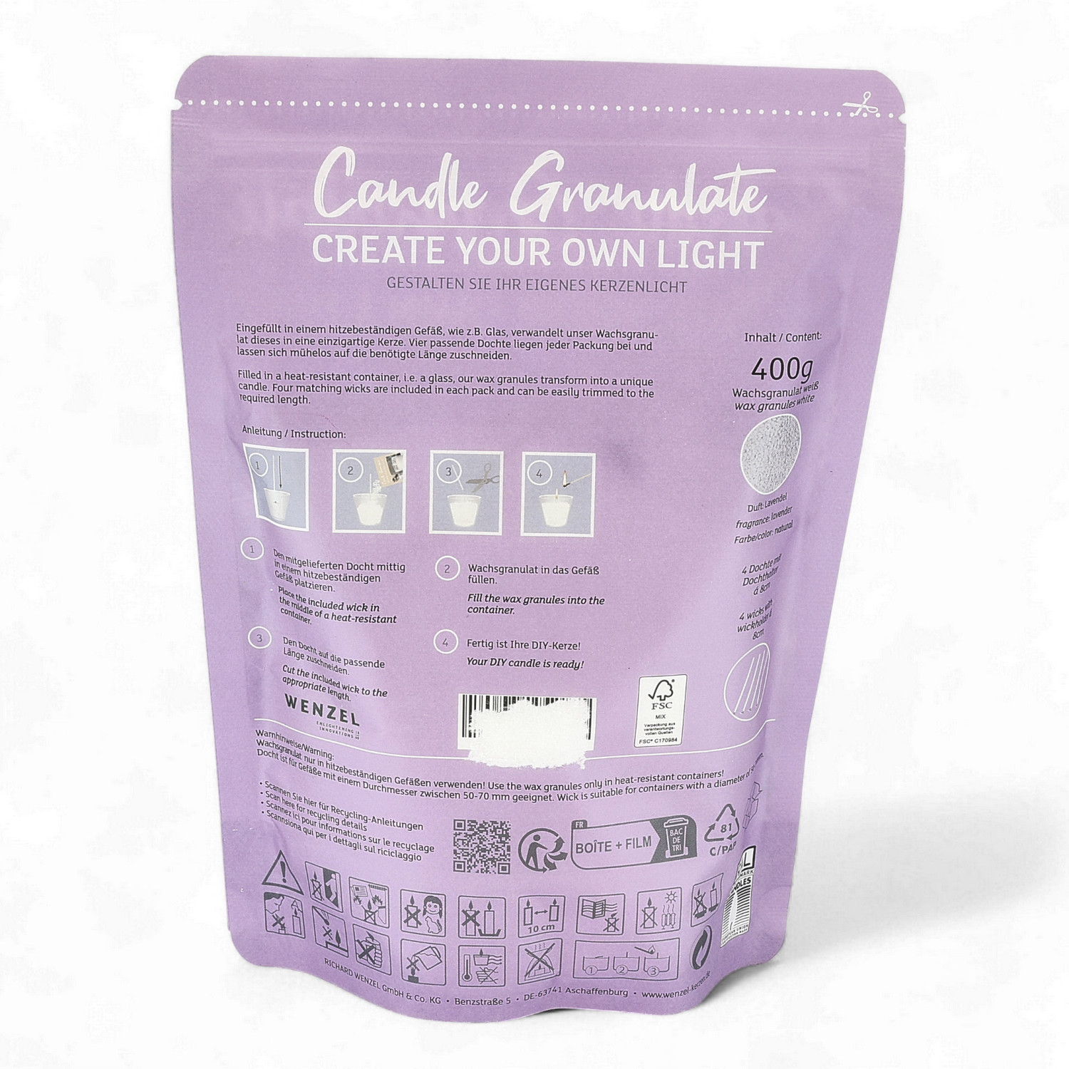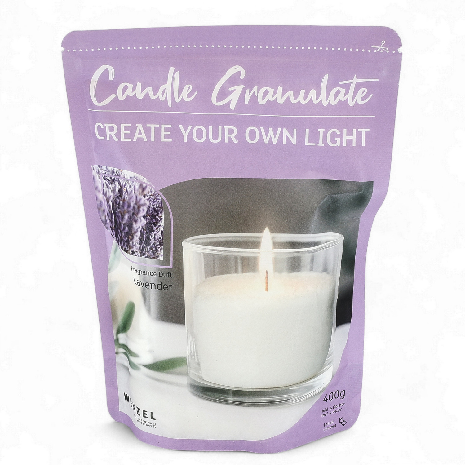 Jede Packung enthält 400 g weisses Wachsgranulat sowie vier passende Dochte, die sich leicht auf die gewünschte Länge zuschneiden lassen.
