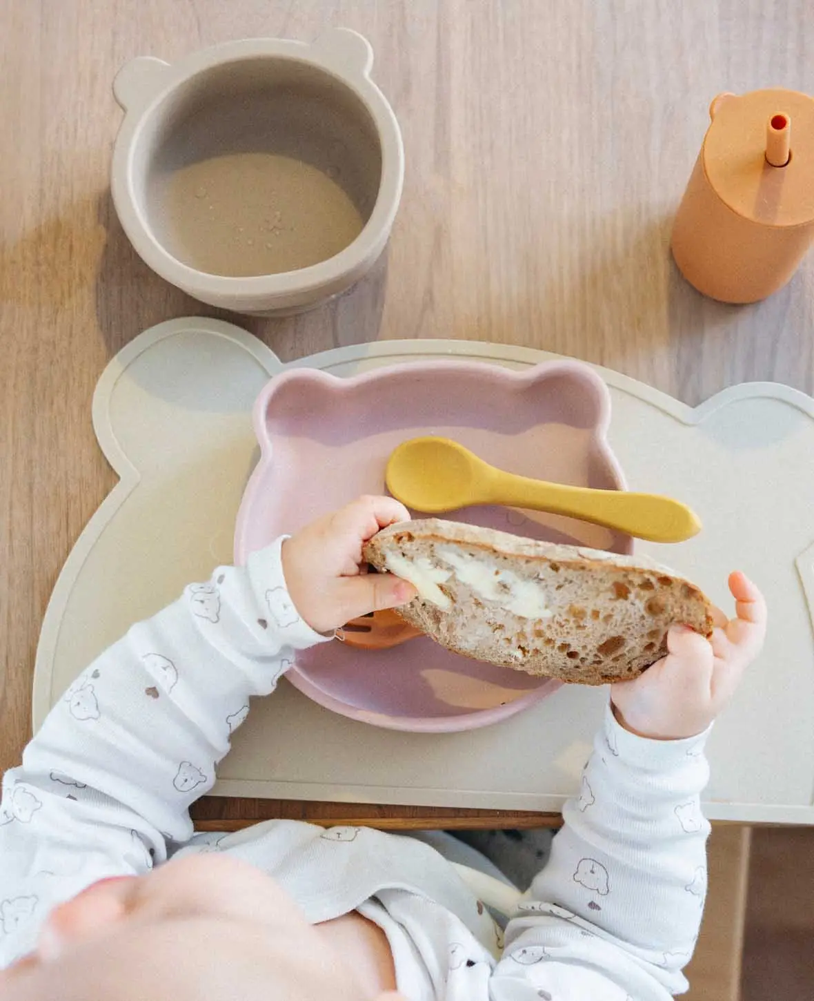Kinder Geschirrset “Bär”, aus Silikon in Sienna/Beige/Rostrot, mit Tellern, Besteck, Becher, Tischset und Lätzchen