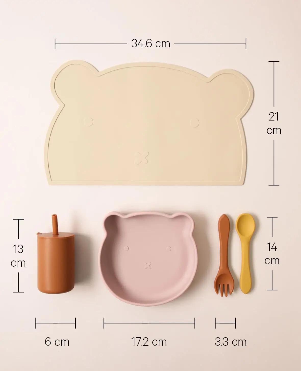 • 1 x Tischset in Bärenform, 2 x Teller in Bärenform in verschiedenen Grössen mit Saugnapf, 1 x Trinkbecher mit Strohhalm, 1 x Lätzchen mit Auffangschale, 1 x Gabel, 1 x Löffel