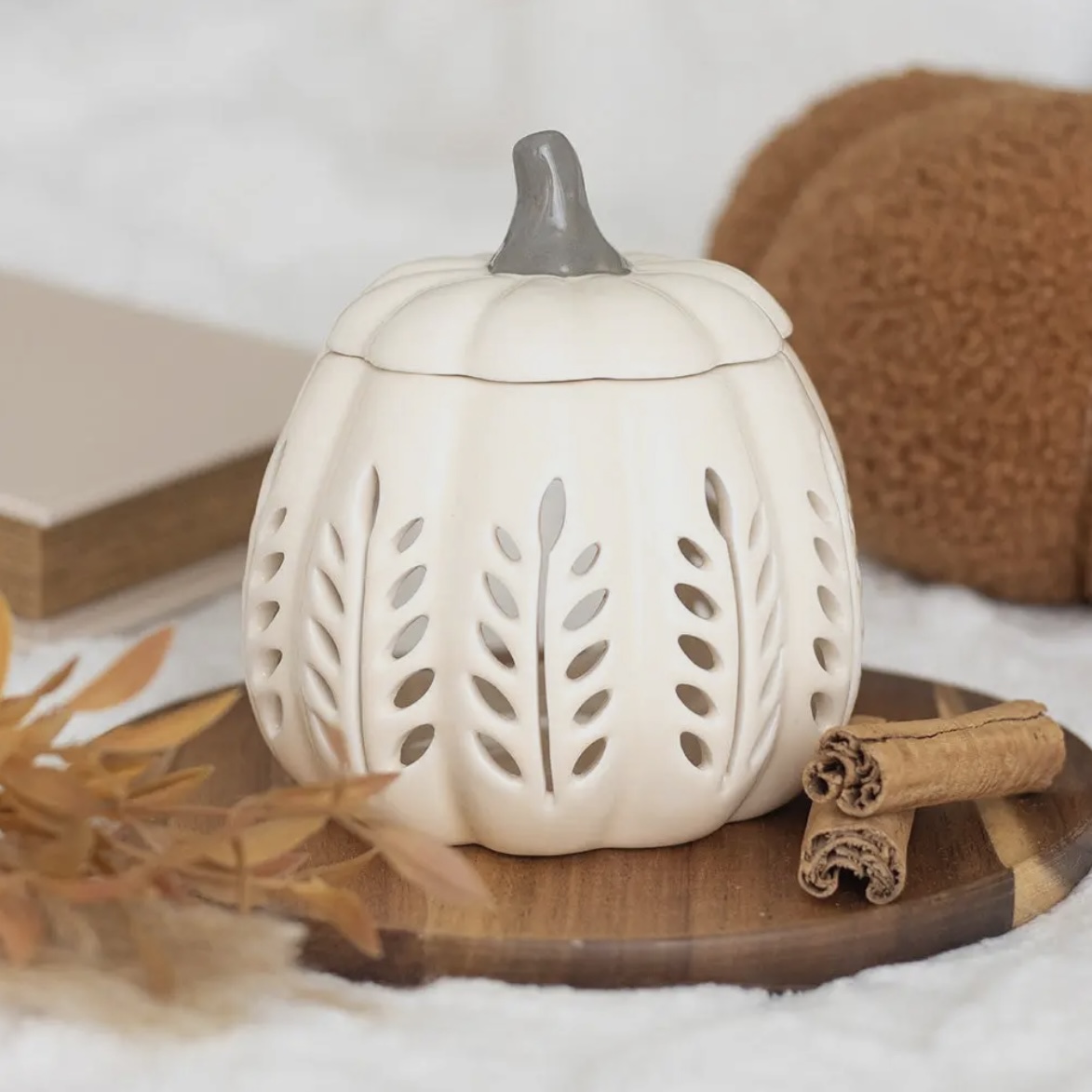 Ajoute une touche d'élégance automnale à ta maison avec ce brûleur à huile et chauffe-cire en forme de citrouille de couleur crème, avec des découpes pour créer une atmosphère chaleureuse lors des soirées fraîches. Un brûleur parfait pour faire fondre de la cire d'inspiration automnale ou des huiles parfumées, qui remplira la maison avec les parfums apaisants de la saison.
