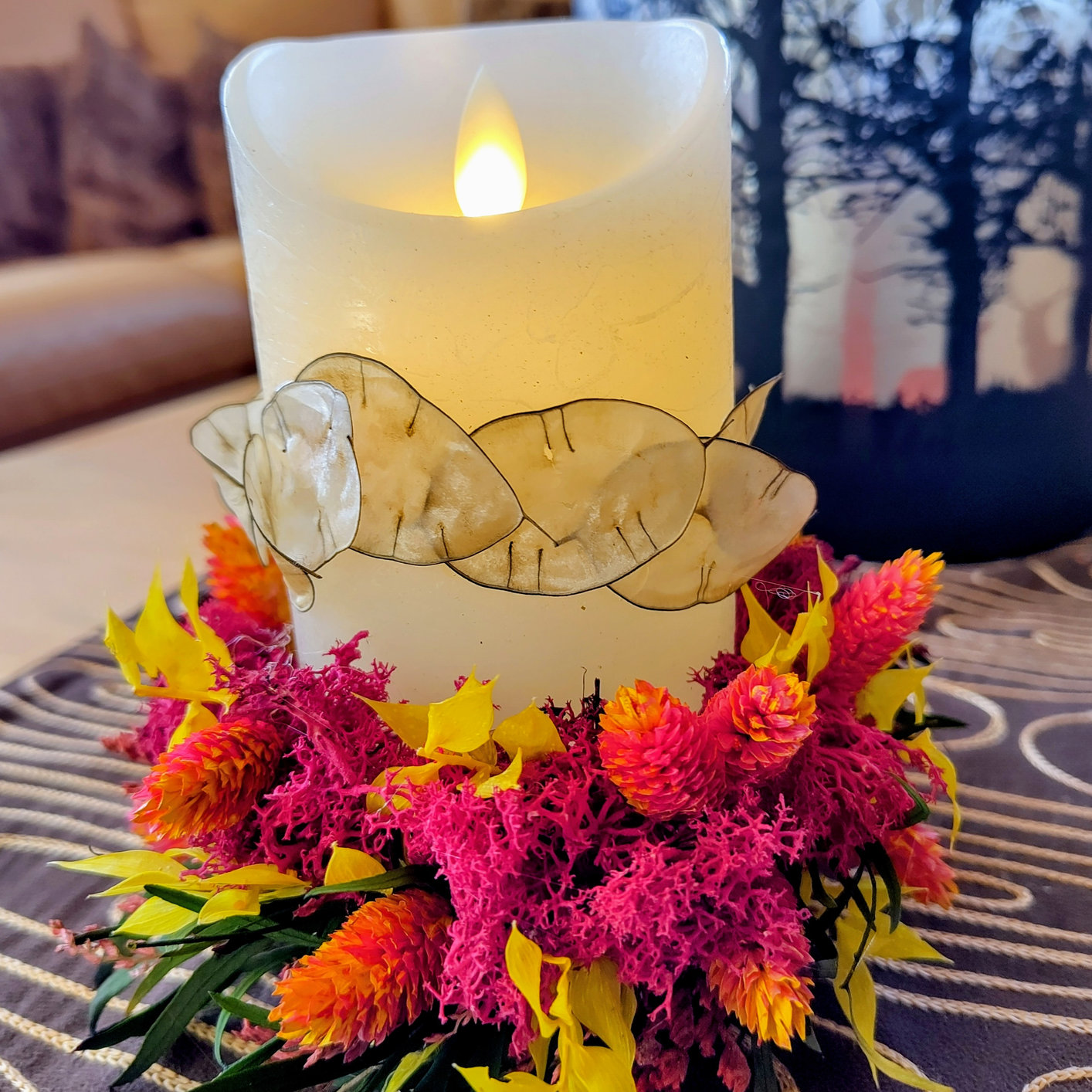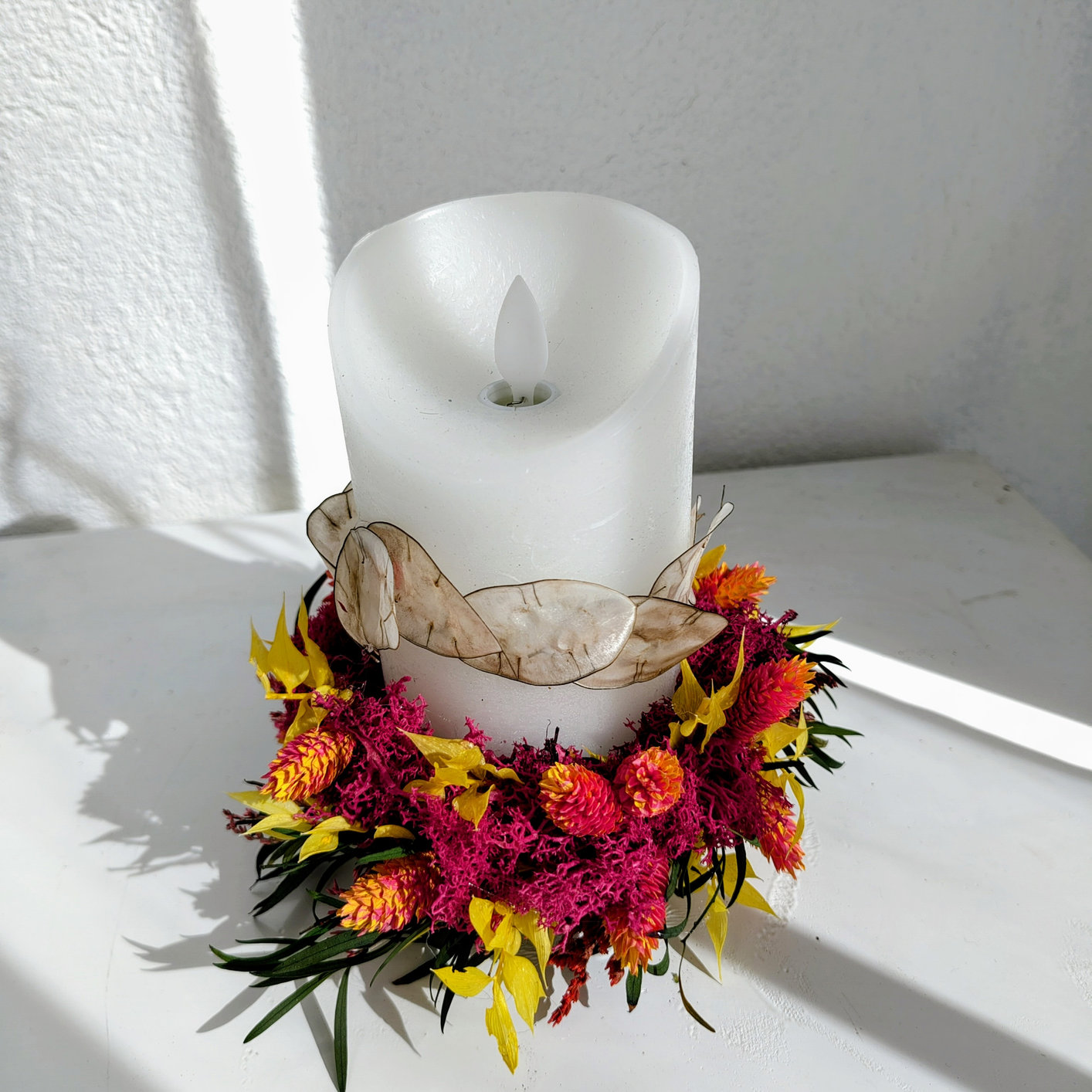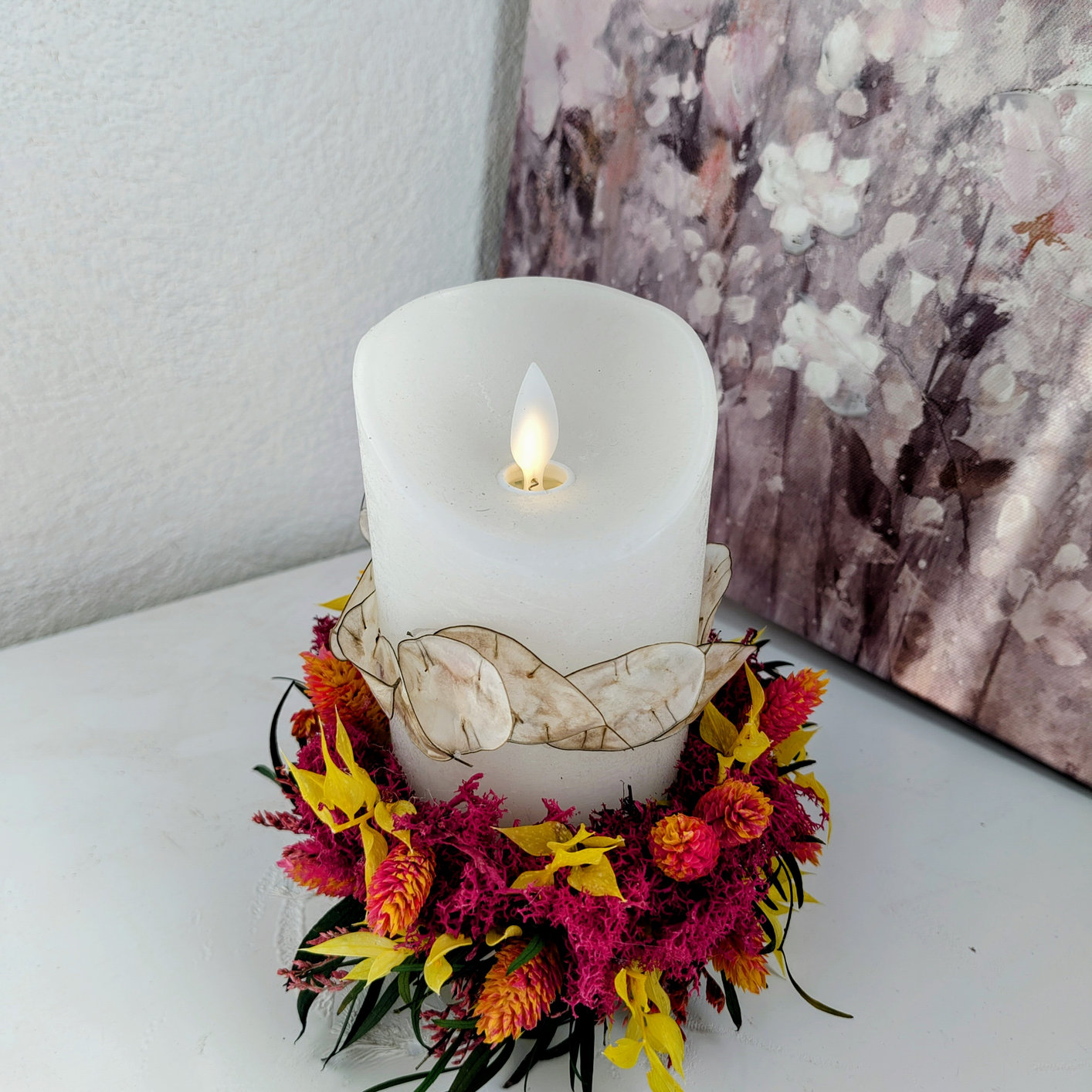 Wunderschöne Kerze, rundum mit getrockneten Blumen verziert, für schöne Feiertage oder einfach nur, um ein wenig Licht in dein Zuhause zu bringen.