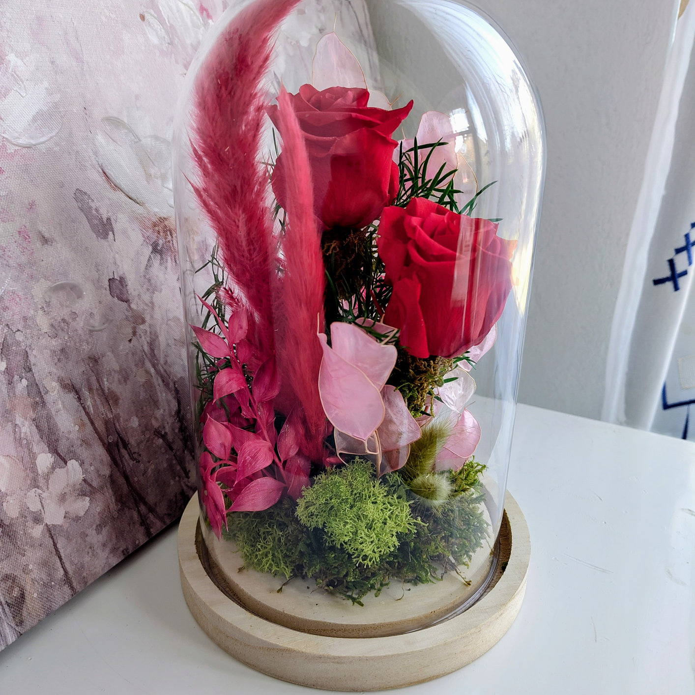 Wunderschöne Glasglocke, begleitet von stabilisierten roten Rosen und getrockneten, stabilisierten Pflanzen, pflegefrei und mehrere Jahre haltbar.