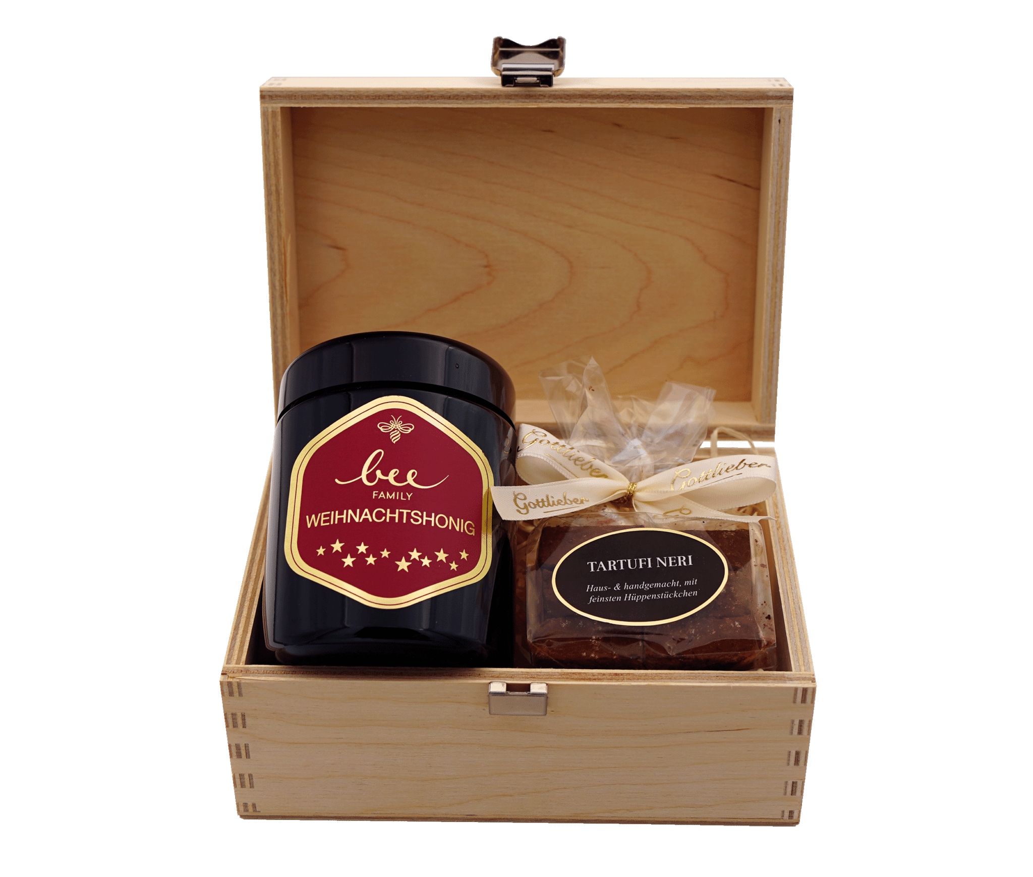 Notre solo de miel "Doux Noël" comprend, en plus de notre délicieux miel de Noël, de délicieux Tartufi Neri de Gottlieber, emballés dans notre boîte en bois véritable Bee-Family et imprimés avec un motif de Noël.