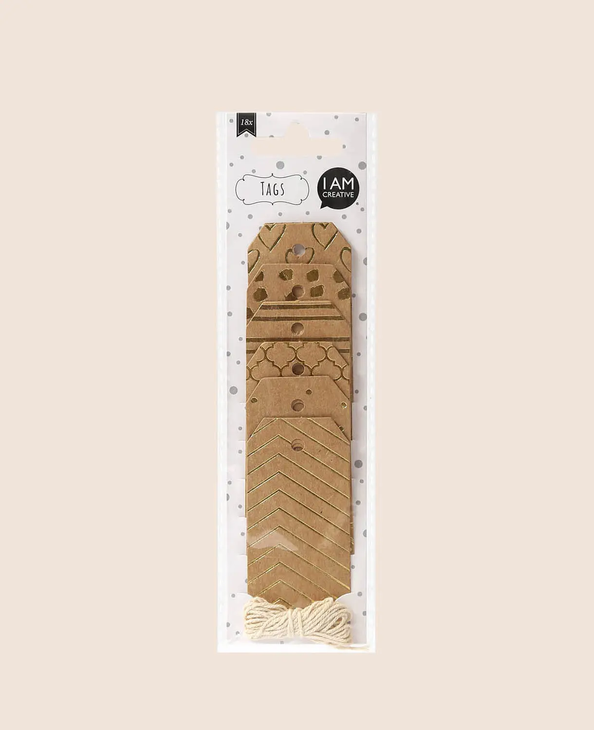 Tags, naturel/doré,18 pièces et 2 m de ficelle