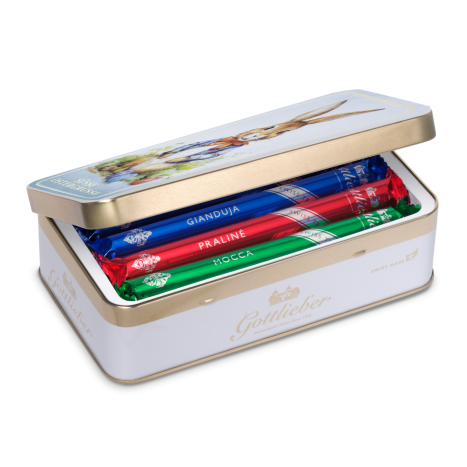 Unsere elegante Schmuckdose «Felix» mit hübschem Ostersujet im Retro-Stil erfreut zu Ostern Jung und Alt und schickt süsse Ostergrüsse. Die Schmuckdose ist gefüllt mit 10 Hüppen der Traditionsmischung (Praliné, Mocca, Gianduja).