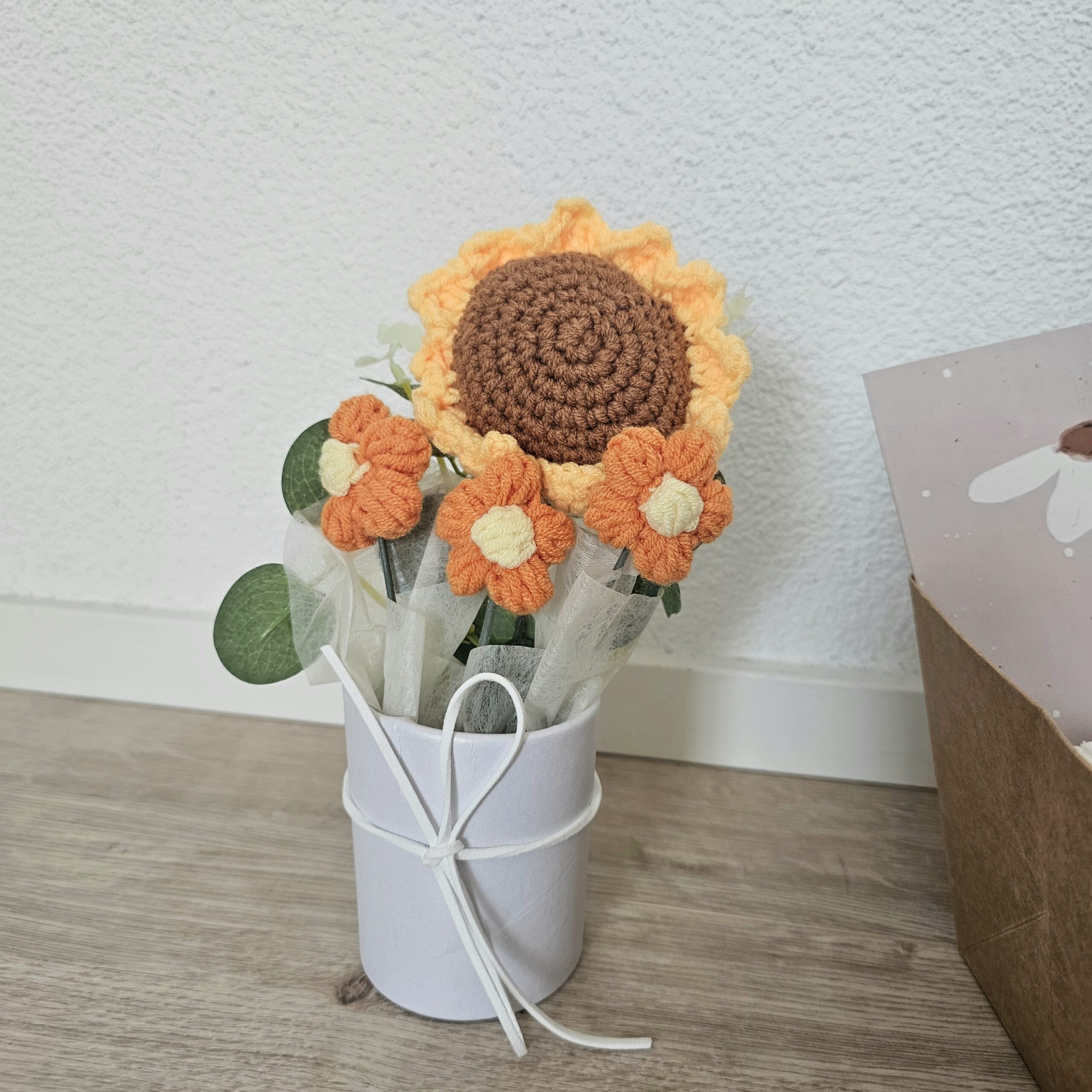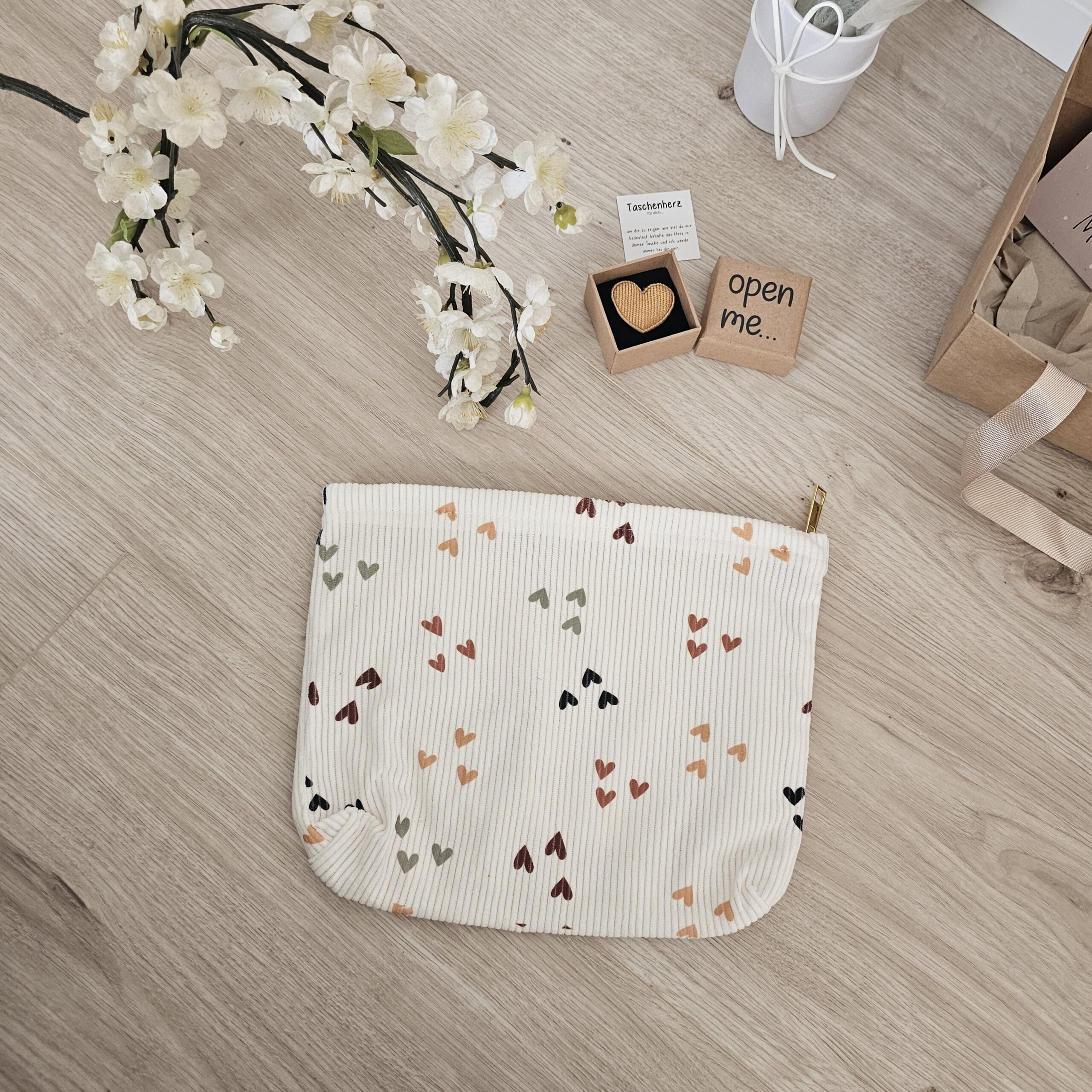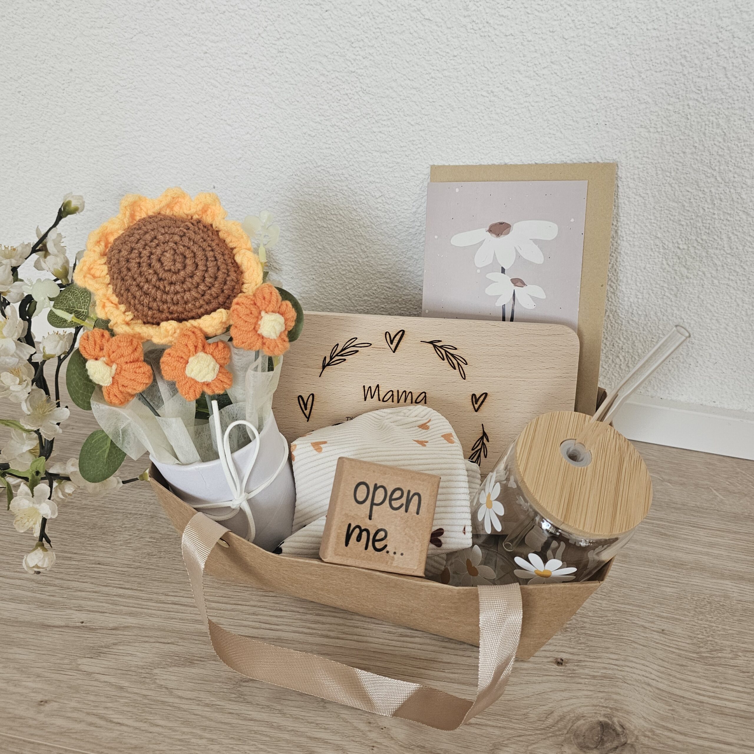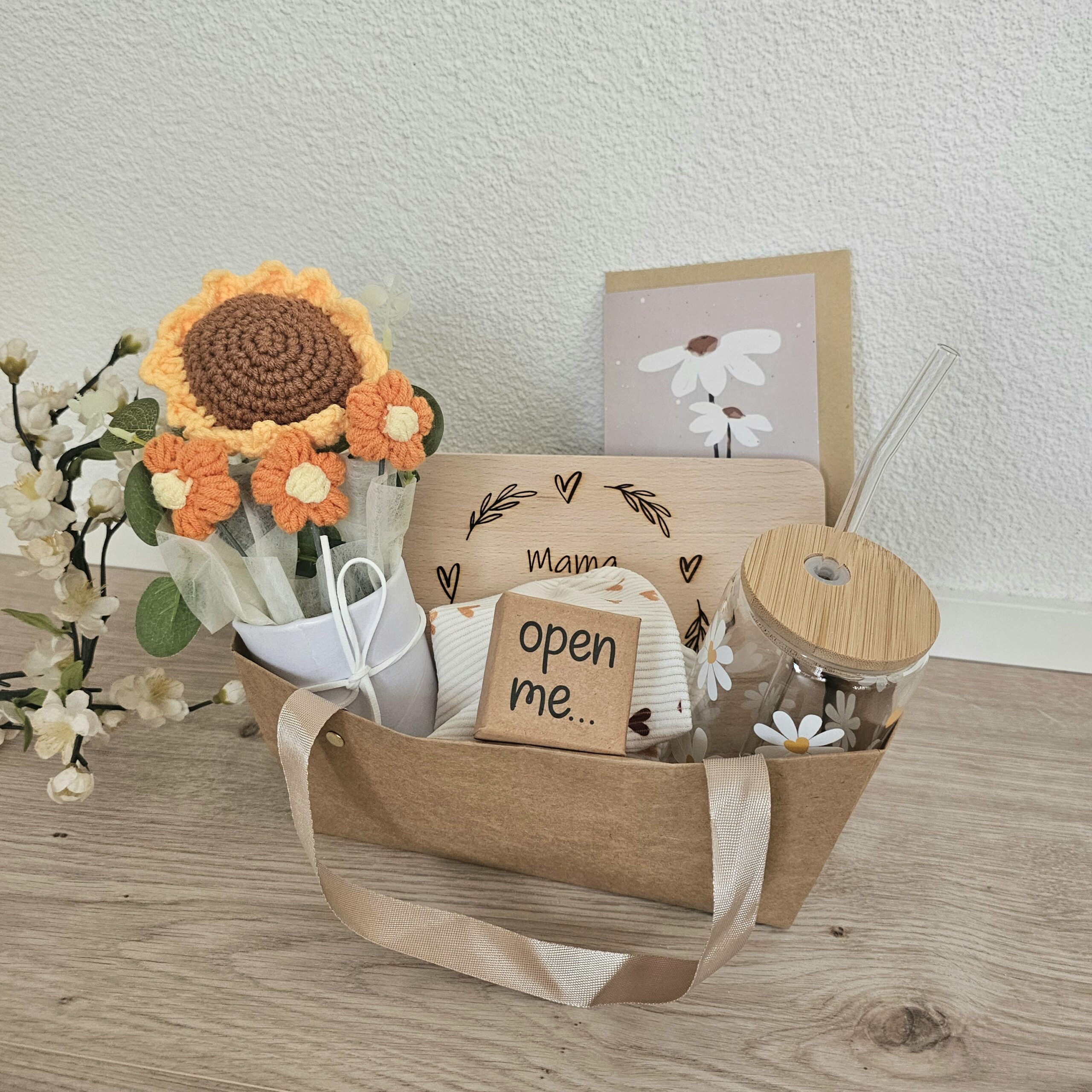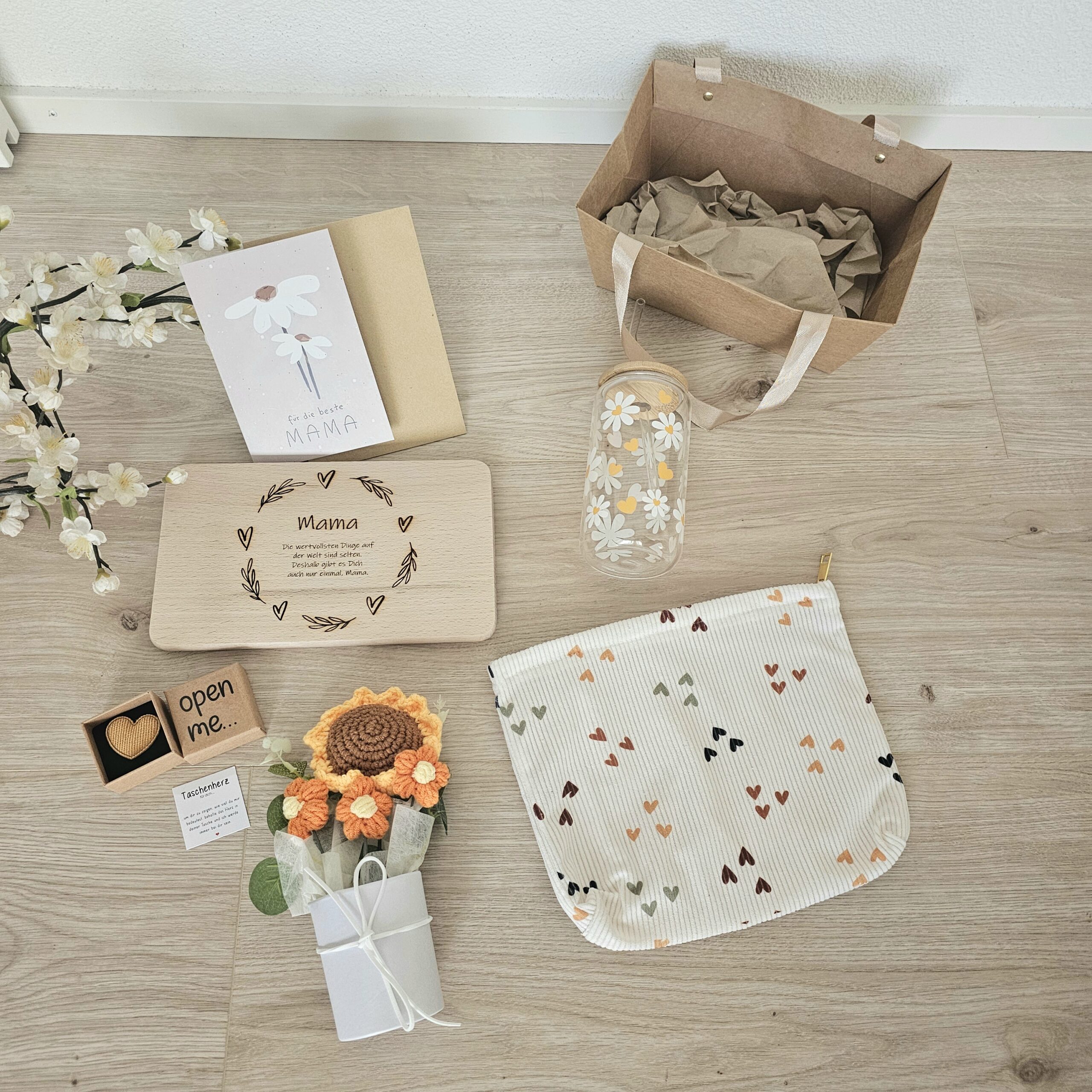 Sont inclus un verre à boire, une planche à découper, un cœur de poche, une trousse de toilette pratique, des fleurs décoratives au crochet et une petite carte avec enveloppe pour tes mots personnels.