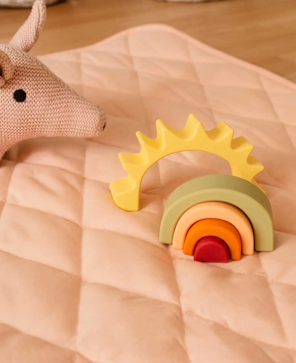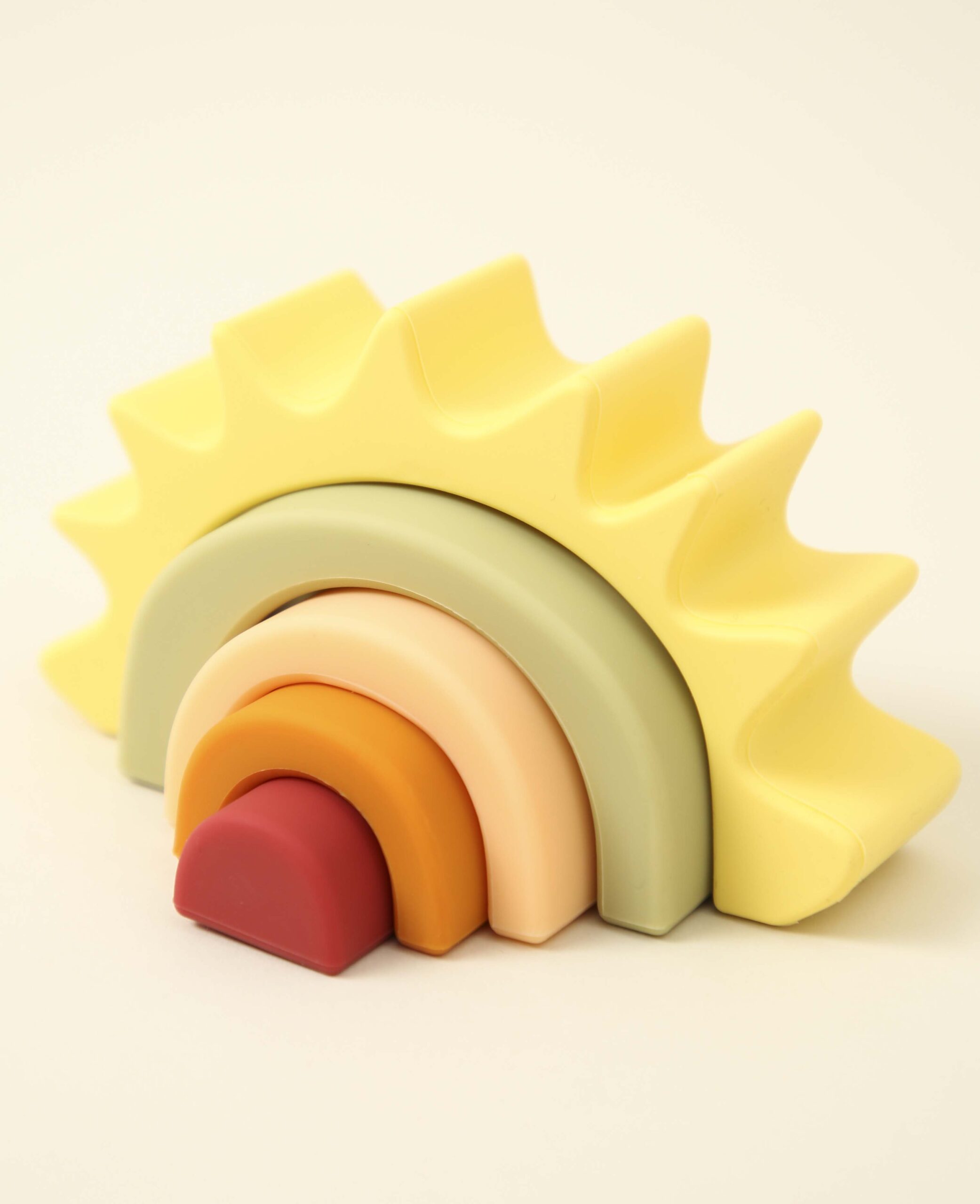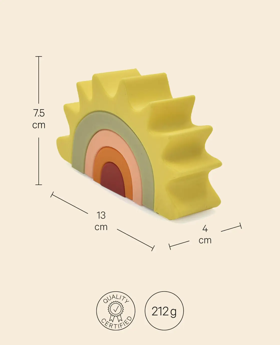 Dieses süsse Stapelspielzeug in Sonnenform ist perfekt für kleine Kinderhände, die spielerisch Greifen und Zusammenbauen erlernen und unterstützt die Entwicklung der Hand-Augen Koordination. Behutsam hergestellt aus BPA freiem und lebensmittelechte Silikon, was es gleichzeitig zu einem idealen Beissspielzeug macht und wundes Zahnfleisch beim Zahnen angenehm beruhigt. Das leichte und dennoch robuste Silikon richtet beim Herunterfallen oder Spielen keine Schäden oder Lärm an – perfekt wenn die Kleinen um sich werfen.