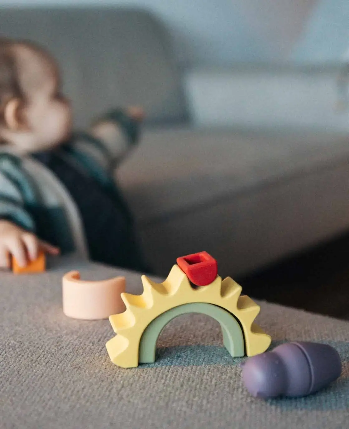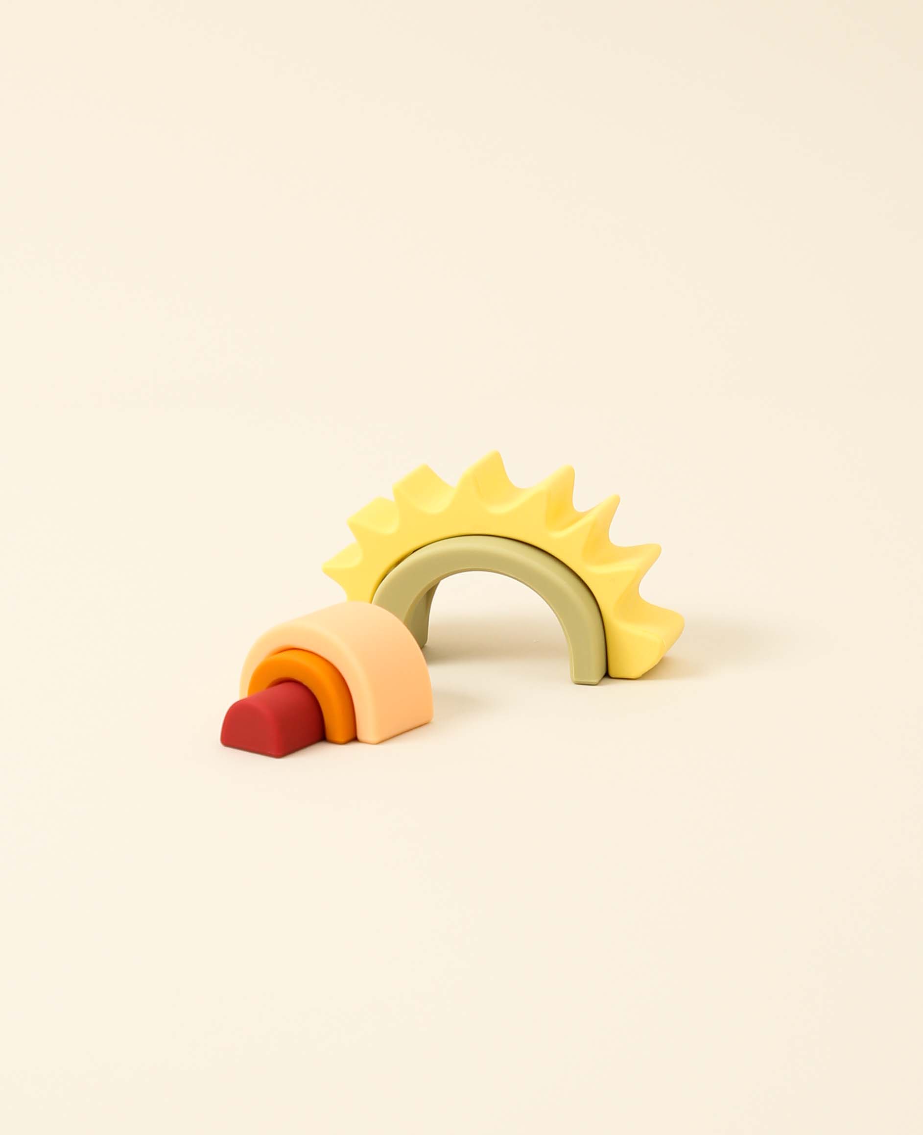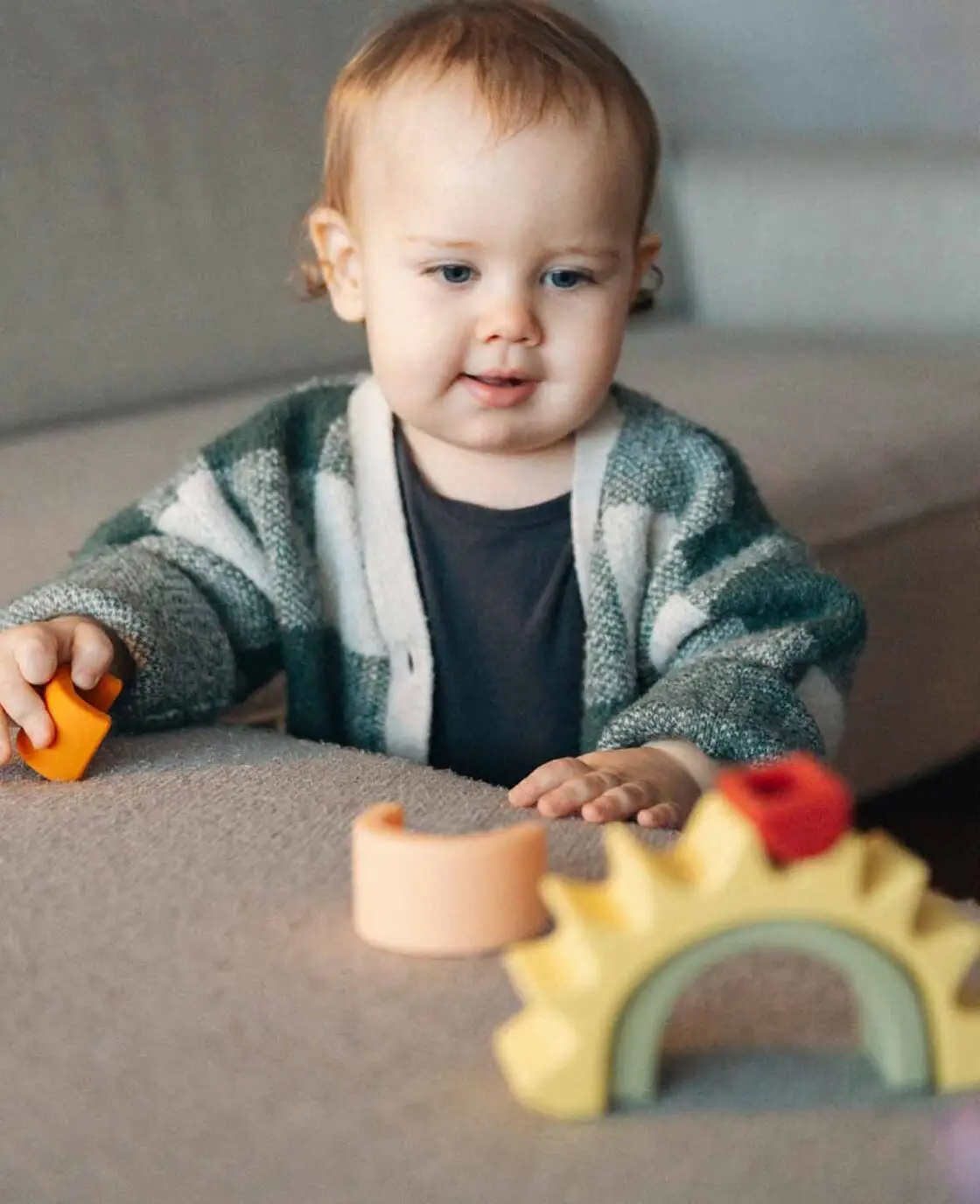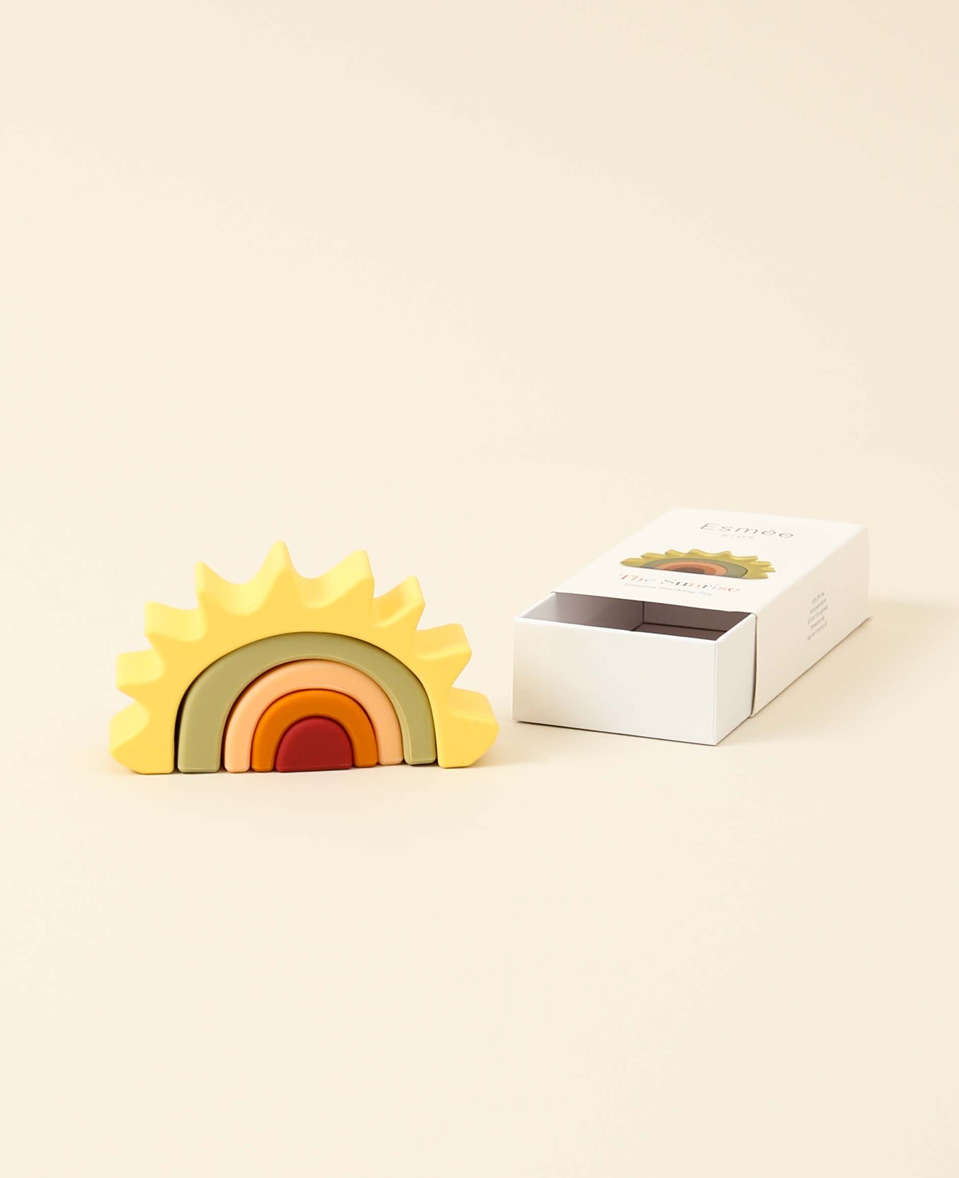 Dieses süsse Stapelspielzeug in Sonnenform ist perfekt für kleine Kinderhände, die spielerisch Greifen und Zusammenbauen erlernen und unterstützt die Entwicklung der Hand-Augen Koordination. Behutsam hergestellt aus BPA freiem und lebensmittelechte Silikon, was es gleichzeitig zu einem idealen Beissspielzeug macht und wundes Zahnfleisch beim Zahnen angenehm beruhigt. Das leichte und dennoch robuste Silikon richtet beim Herunterfallen oder Spielen keine Schäden oder Lärm an – perfekt wenn die Kleinen um sich werfen.