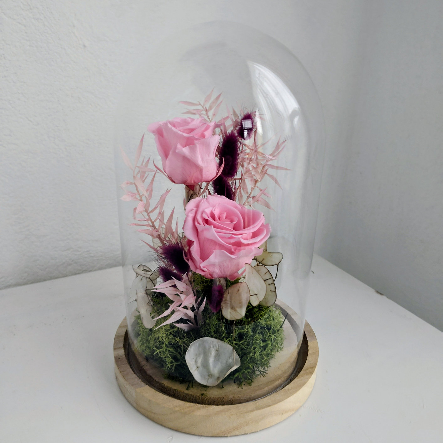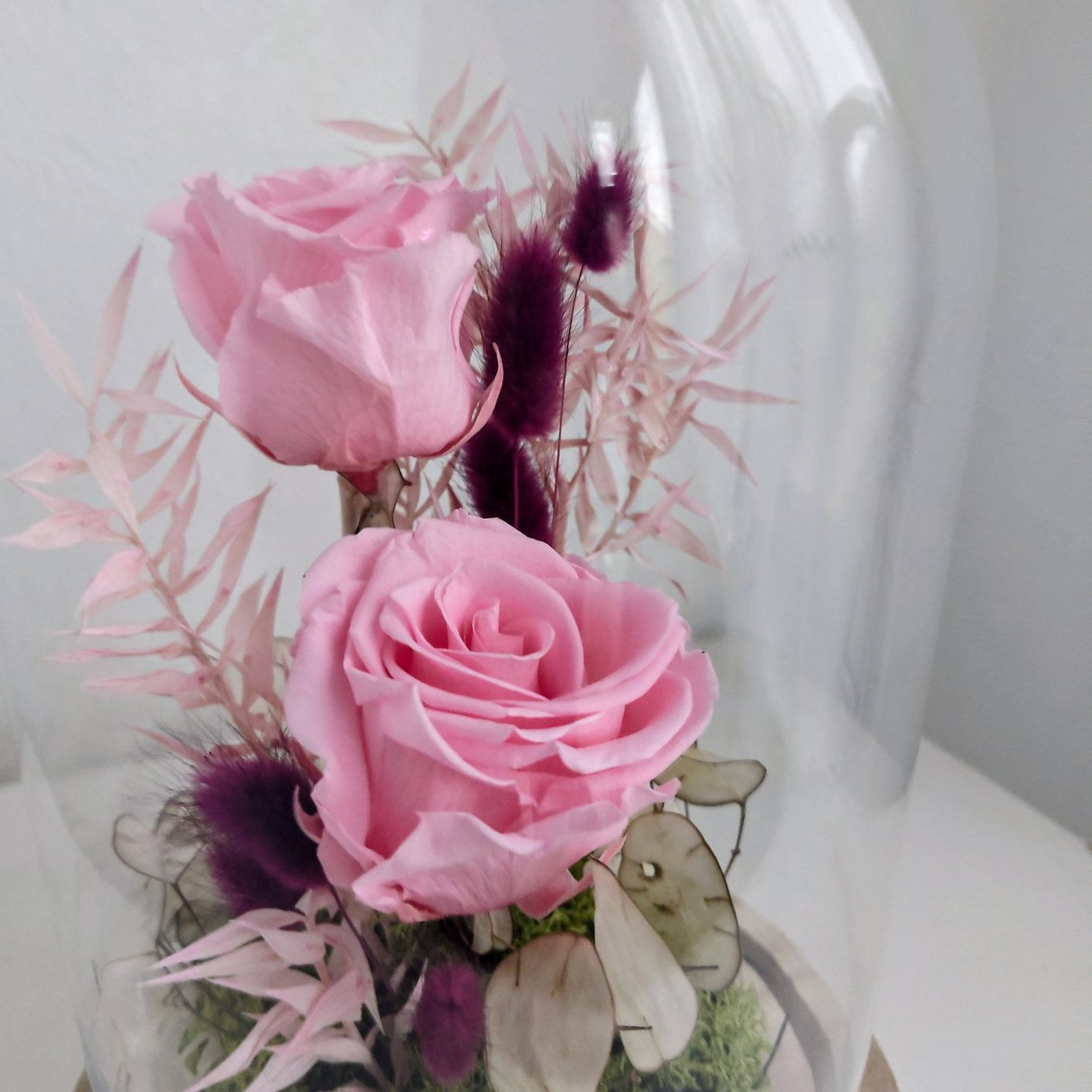 Diese schöne Glasglocke enthält zwei wunderschöne rosa konservierte Rosen, getrocknete Pflanzen und konserviertes Moos, ist handgefertigt, pflegefrei und hält mehrere Jahre.