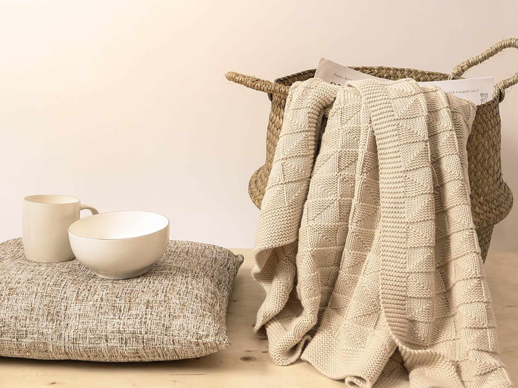 Mit dieser ultra-kuschligen, beigen Baumwolldecke mit eingearbeitetem Strickmuster lässt es sich wunderbar auf dem Sofa einkuscheln. Das hochwertige Baumwollgarn sorgt für ein aussergewöhnlich weiches Finish.
