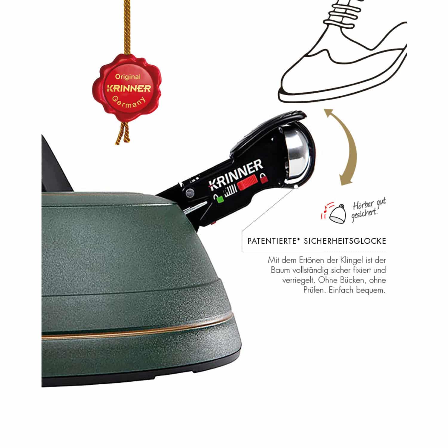 La ligne Ultra Grip actuelle a également été améliorée avec une nouvelle pédale de sécurité. Une surface d'appui nettement plus grande assure ainsi un maintien optimal de la semelle du pied ou de la chaussure lorsque la pédale est actionnée. Équipés de la technique originale éprouvée du câble unique, tous les supports pour sapins de Noël KRINNER garantissent une pression régulière des griffes sur le tronc. Il suffit de placer l'arbre dans le support, d'appuyer sur la pédale et le tour est joué ! Qu'il soit épais, mince ou qu'il ait poussé de manière tordue, l'arbre est sûr et droit comme un i. La cloche de sécurité brevetée unique au monde dans la pédale signale de manière bien audible lorsque les griffes sont bien fixées à l'arbre et que la fermeture de la pédale est automatiquement enclenchée. Il n'est donc plus nécessaire de se pencher pour vérifier si l'arbre est bien fixé ou pour verrouiller le levier au pied. De plus, la ceinture de sécurité brevetée assure une sécurité supplémentaire grâce à son mécanisme d'ouverture progressive et empêche tout basculement involontaire.
