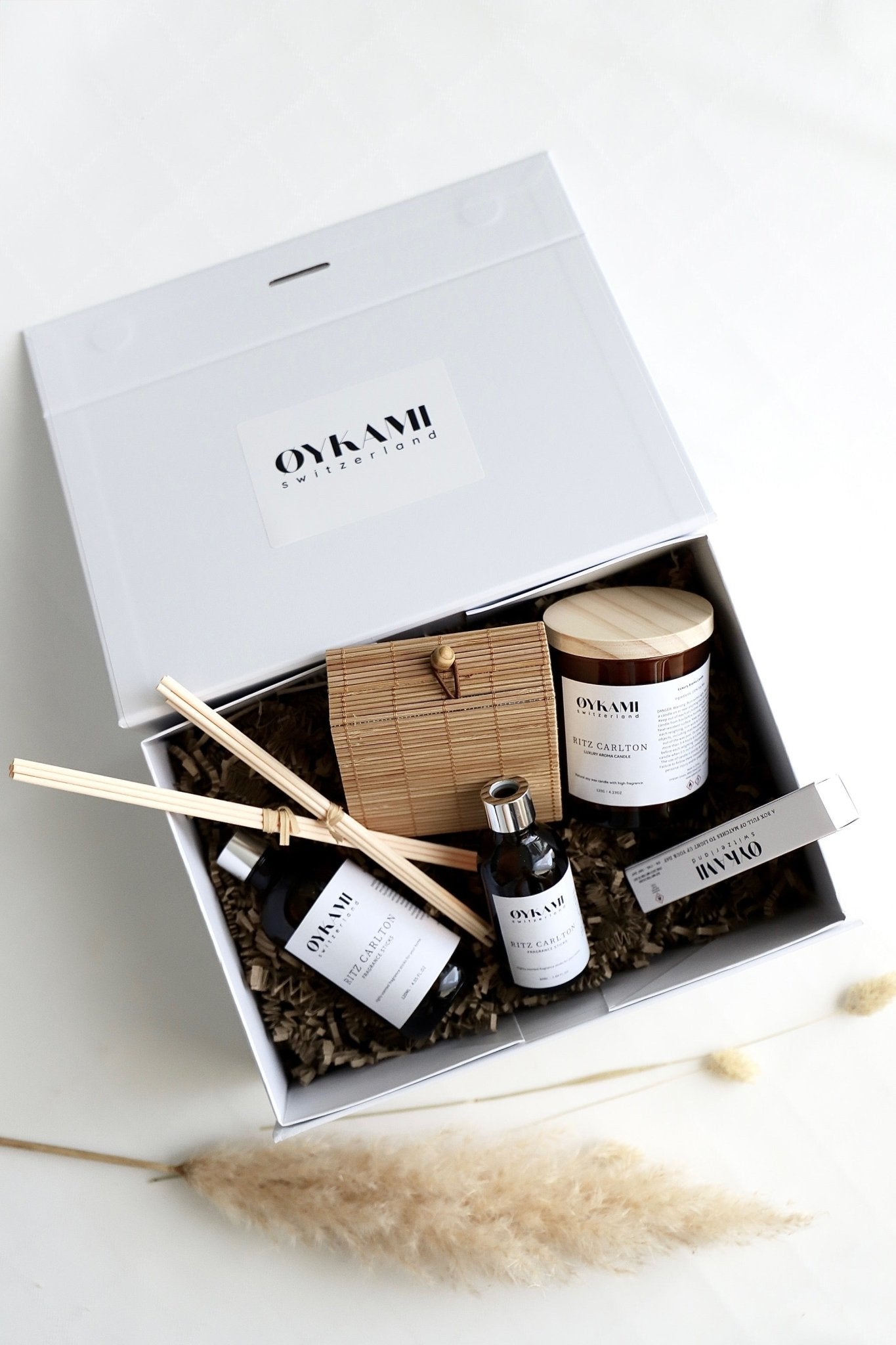 Le cadeau est livré dans un carton blanc de haute qualité et peut être offert immédiatement. Le carton blanc contient un aimant pour le maintenir ensemble, il est extrêmement stable et peut être réutilisé. Il est accompagné d'un joli nœud cadeau.