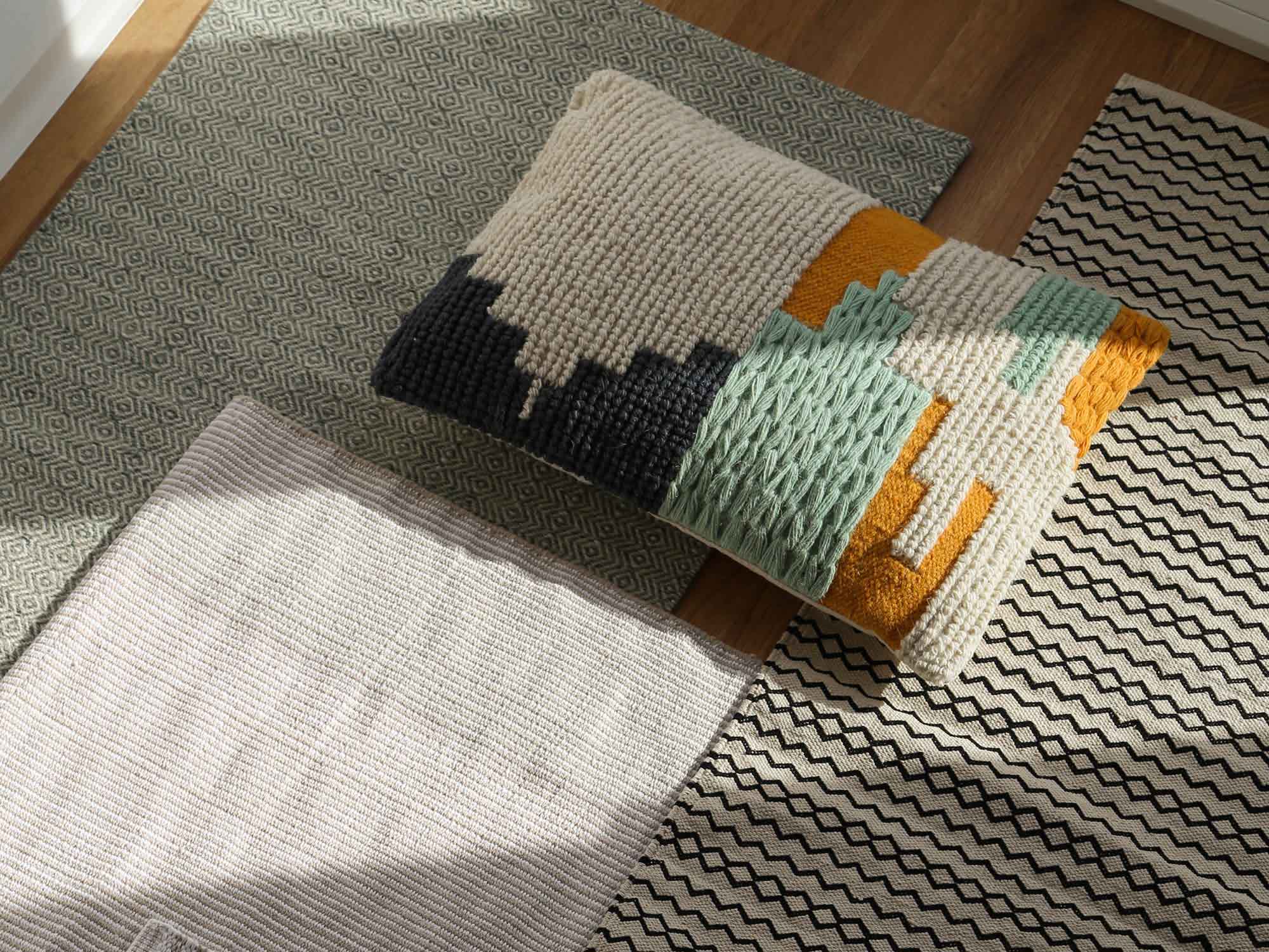 • Wollteppich mit salbeifarbenem und cremefarbenem Ethno Webmuster