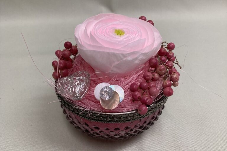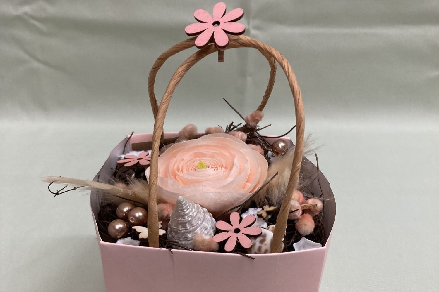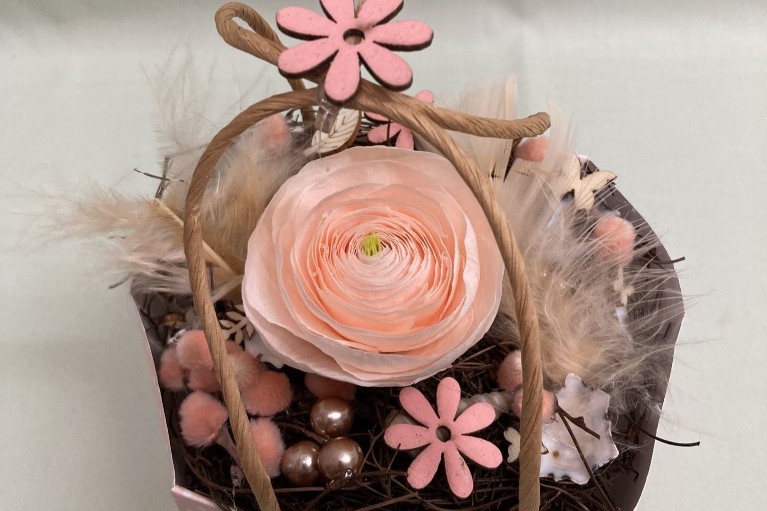 Arrangement avec une renoncule stabilisée dans un pot de bouleau