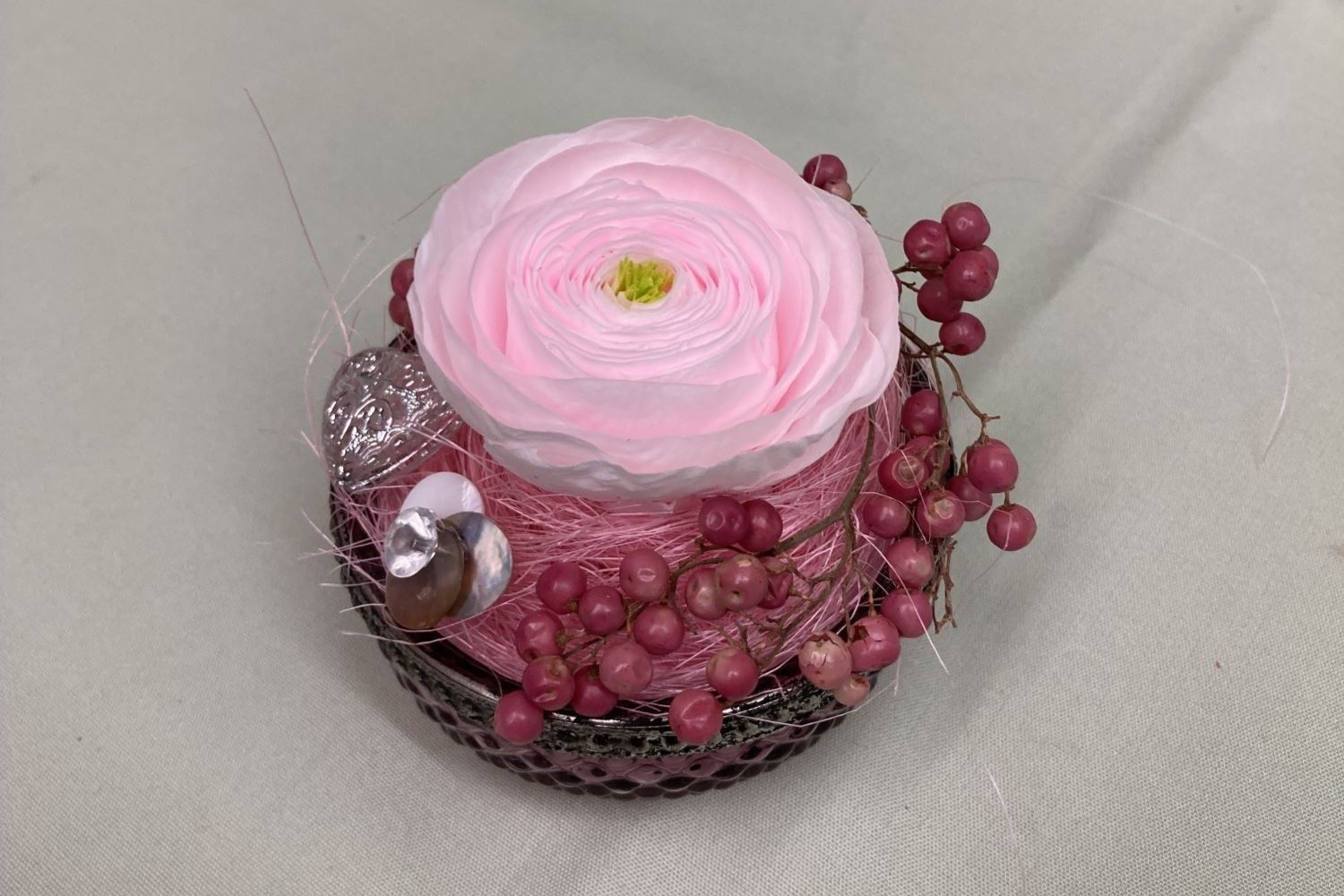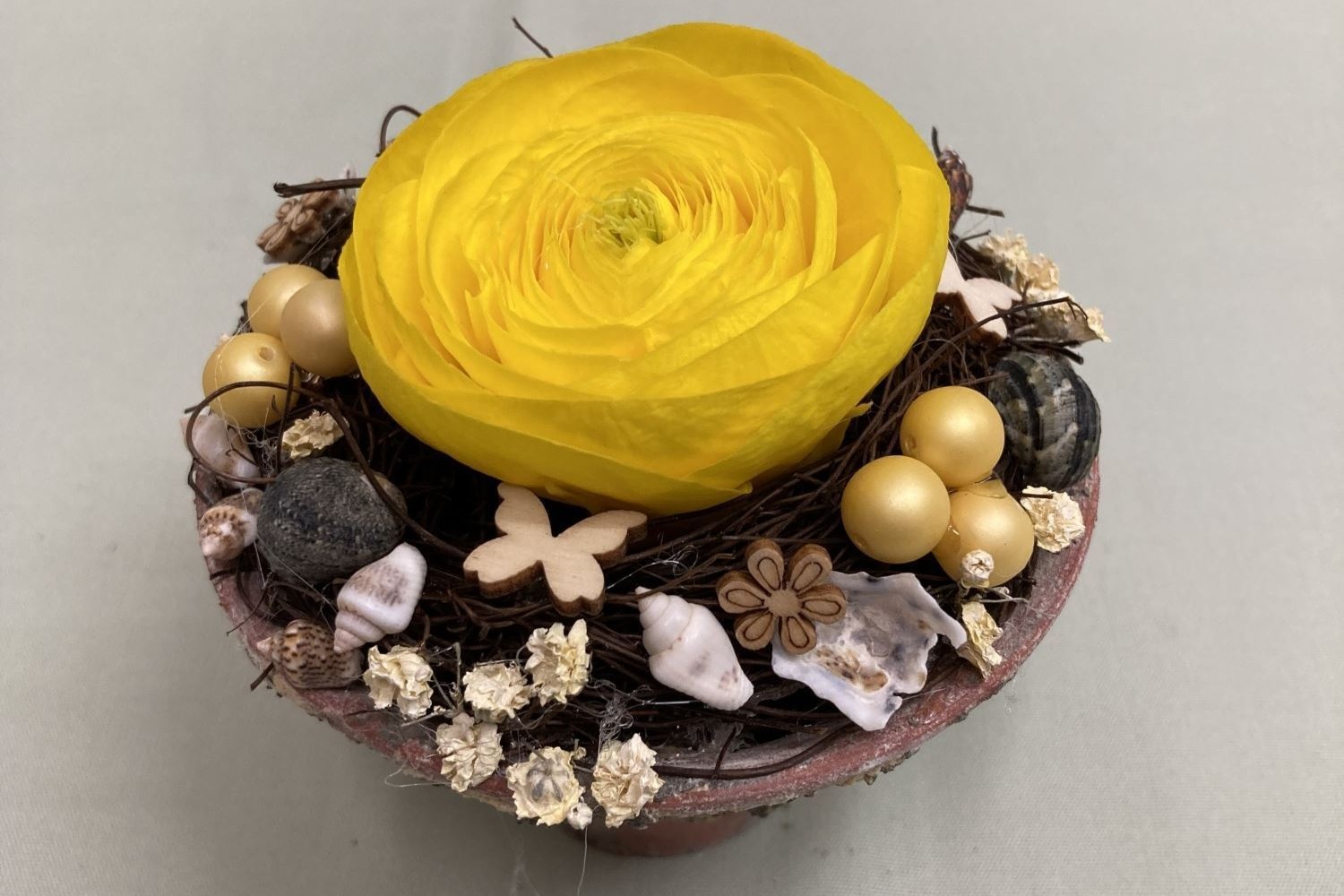 Arrangement avec une renoncule stabilisée dans un pot de résine